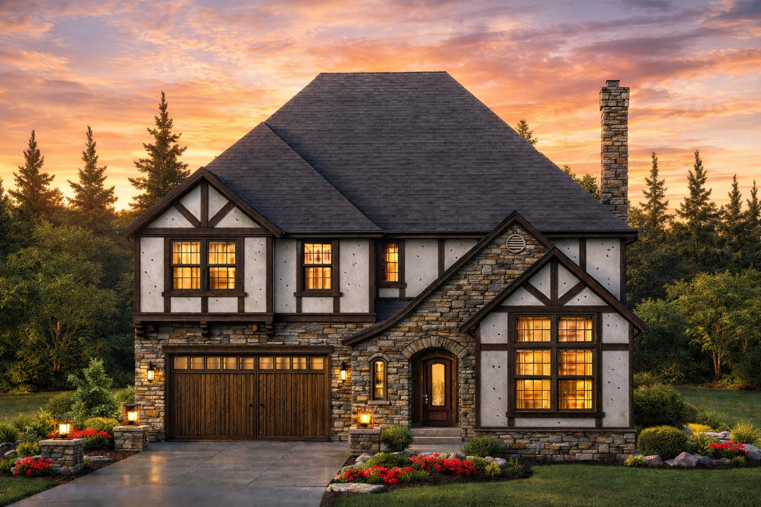 Tudor Style House Plans feature Steep pitched roofs, in combination with front gables and hips, along with front cross gables defining this popular and historic style. Half-timbering is present on most Tudor homes, along with tall narrow windows in multiple groups and with grilled glazing. Massive chimneys are common to the Tudor Style.