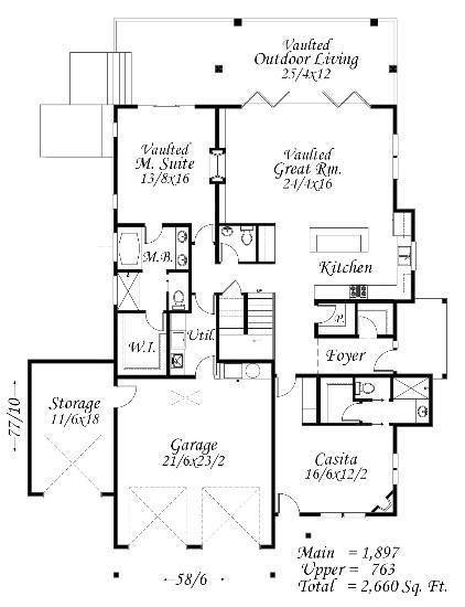 This design is perfect for the empty nester! Everything is here including a vaulted great room, overlook loft, large vaulted outdoor living, main floor master suite with fireplace, and a gourmet kitchen. Most important though is the Casita. This flexible self sufficient space is perfect as an office, studio, guest suite, or any multi-generational household. The craftsman lodge exterior is comfortable in any setting. Upstairs is a huge loft with another bedroom suite, a loft office, and storage space. Unbelievable features in a home at 2660 sq. feet!