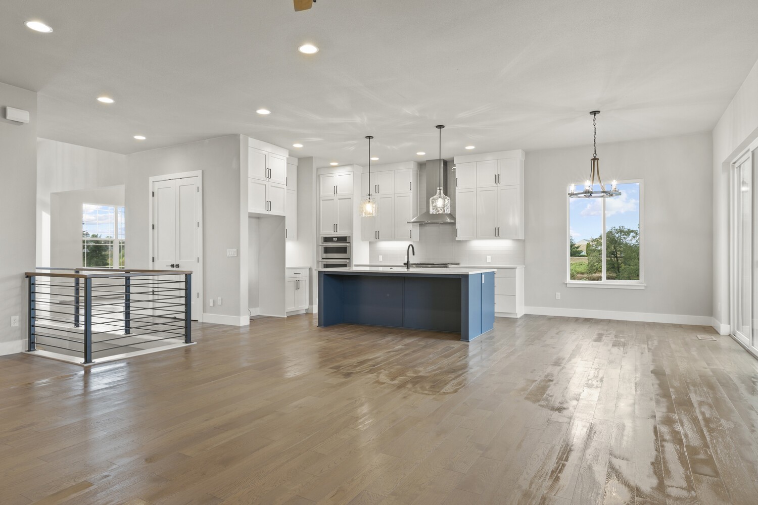 The exterior screams classic prairie style and echoes the calming and restful homes that made this style so popular. The main floor offers a grand entrance thanks to the 12′ ceiling in the foyer, where you can head left to the formal dining room or right to the deluxe den. Take a trip through the dining room and past the large walk-in pantry to reveal the cook’s dream kitchen. Huge counters, a large island, and a spacious attached breakfast nook all come together to create a beautiful place to prepare and enjoy a meal. The great room is just beyond and includes a two sided fireplace that extends to the covered deck, accessed via sliding doors in the nook.
