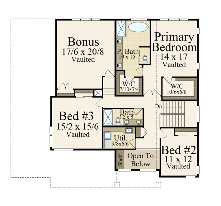 The upper floor includes three vaulted bedrooms as well as a vaulted bonus room that can easily serve as a fourth bedroom. The two bedrooms at the front of the home get plenty of natural light and share a full bath with two sinks between them. The utility room is also nearby, ensuring easy laundry day for anyone in the home. The primary bedroom, located at the rear right corner, offers up deluxe living thanks to its vaulted ceiling, expansive bathroom, and dual walk-in closets.
