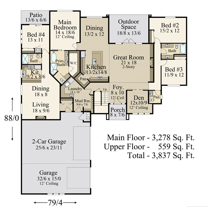 The experience begins from the driveway, where a 3 car garage sits on the left, and the porch straight ahead. Through the porch, you’ll enter the 12′ foyer. To the left reside the laundry room, mud room, and garage entrance, to the right the den, a powder room, and a few guest bedrooms, and straight ahead, a magical living space. The great room offers everything from a fire place to a two story ceiling, a fantastic outdoor space, and large built in storage. Attached to the great room in classic open concept fashion are the dining room and kitchen. We’ve outfitted this kitchen with all of the gourmet touches the avid home cook desires, from a large walk-in pantry, to a social island, and easy access to all of the living spaces, ensuring meals are enjoyable and never stressful. Over towards the dining room, find the door to the main bedroom, which should provide immense levels of comfort, thanks to its jam packed en suite.