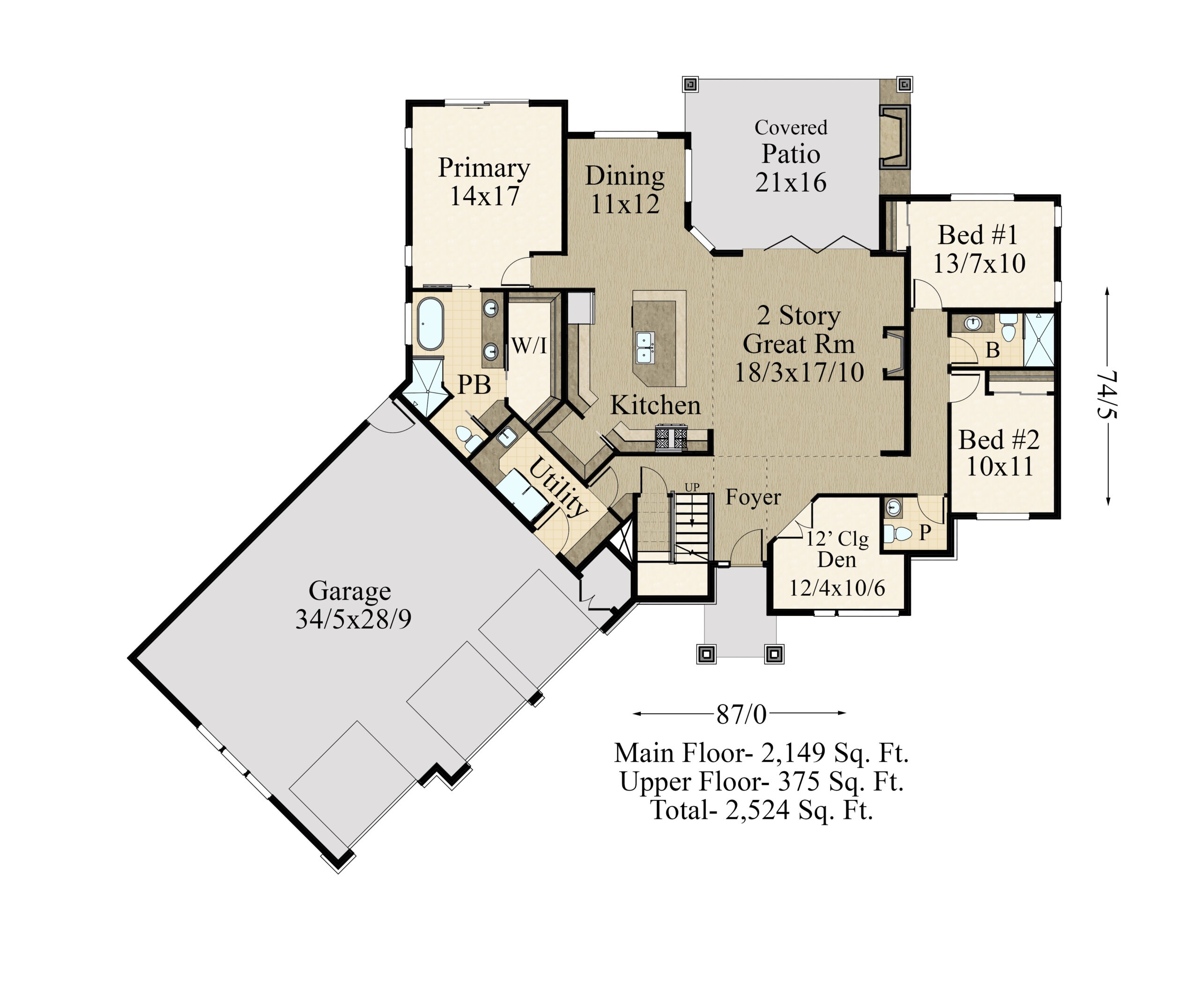 Driving up, you’ll see the three car garage elegantly sweep out from the left side of the home. Walking inside, you’ll see the lovely den to your right, with a 12′ ceiling and a powder room just next door. The 2 story great room of this home design is the nucleus of the main floor, with the kitchen, dining room, and covered patio all surrounding. The kitchen is a joy for even the most discerning of home cooks, with counter space and cabinets galore, a walk-in pantry, and a huge island with room for food prep, casual dining, and even a little work. Both the great room and the covered patio are augmented by beautiful fireplaces. There are three bedrooms on the main floor of this house plan, with the primary suite sitting just off the dining room. A full en suite bathroom complete with custom shower and standalone tub is sure to fit the bill for just about anybody.