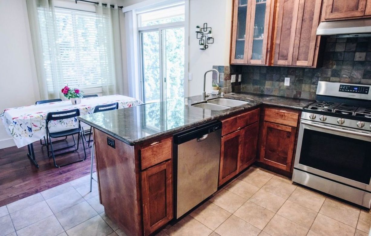 Adjacent to the living area, the vaulted dining room (14’ x 10’) continues the open-concept layout, encouraging easy entertaining and daily connection between family members or guests. The kitchen is smartly tucked behind a semi-open wall to maintain visual flow while defining the cooking space. It includes ample counter space, an efficient work triangle, and a direct line of sight to both the dining and family rooms.