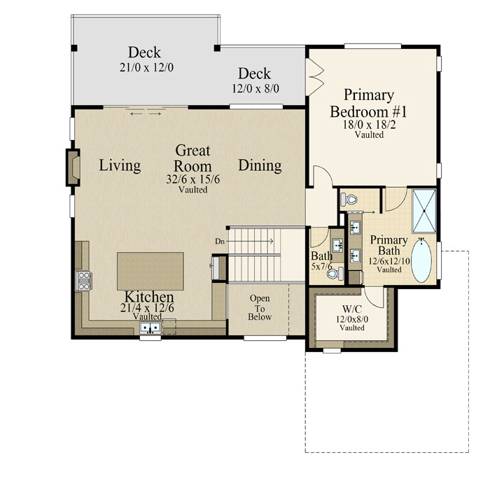 The layout also supports entertaining in a big way. Guests move easily through the open upper level, and the deck expands the living space outdoors. In addition, the vaulted ceiling in the great room adds volume and drama, which helps the home feel even more luxurious.
