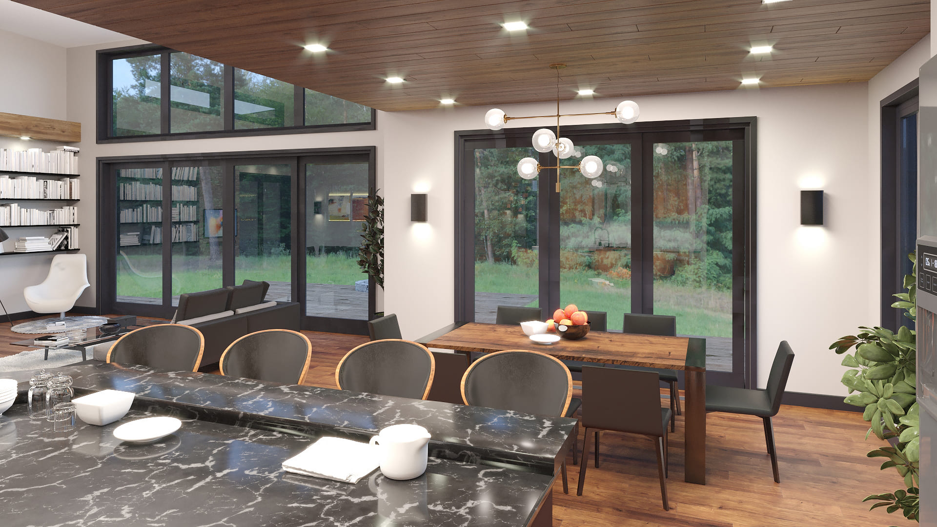 Enter through the front door and arrive at the modest foyer which includes a comfortable den/guest room to the right. A full bathroom just behind makes this an easy choice in the event of an unexpected overnight guest or even a long term family member, friend, or even renter. Just beyond the staircase you’ll come to the open and airy central living arrangement. A fully featured L-shaped kitchen overlooks the almost seamlessly connected dining and living room. We’ve included a large island in the kitchen for additional prep space and as a common gathering space. The sink also looks out over the living area to promote a sense of community. Both the living room and the dining room open up to the rear covered living space that spans the entire width of the home and then some.