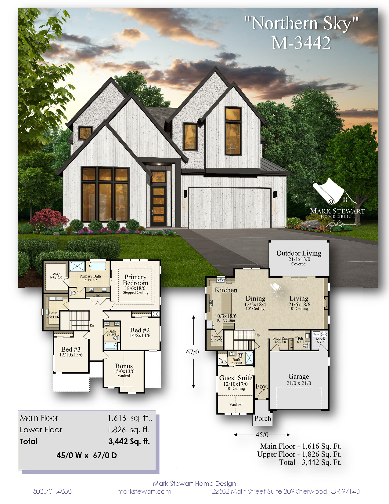 Northern Sky (M-3442) is a two story Nordic Modern house plan that combines Scandinavian simplicity with American comfort. At 3,442 square feet, the design offers clean lines, bright interiors, and flexible rooms that adapt to family life. With a vaulted bonus space, a main floor guest suite, and a covered outdoor living area, Northern Sky delivers both style and everyday function.