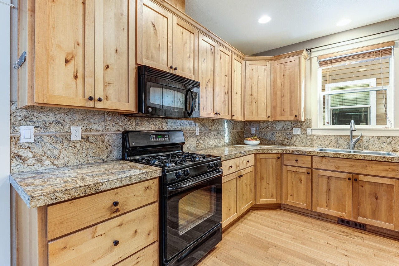 Adjacent to the great room, the kitchen is a cook’s dream—compact yet efficiently laid out with a generous island, high-end appliances, and ample cabinetry. A subtle mix of wood and stone finishes enhances the kitchen’s modern-rustic appeal, while large windows over the sink bring in natural light and offer views of the landscape.