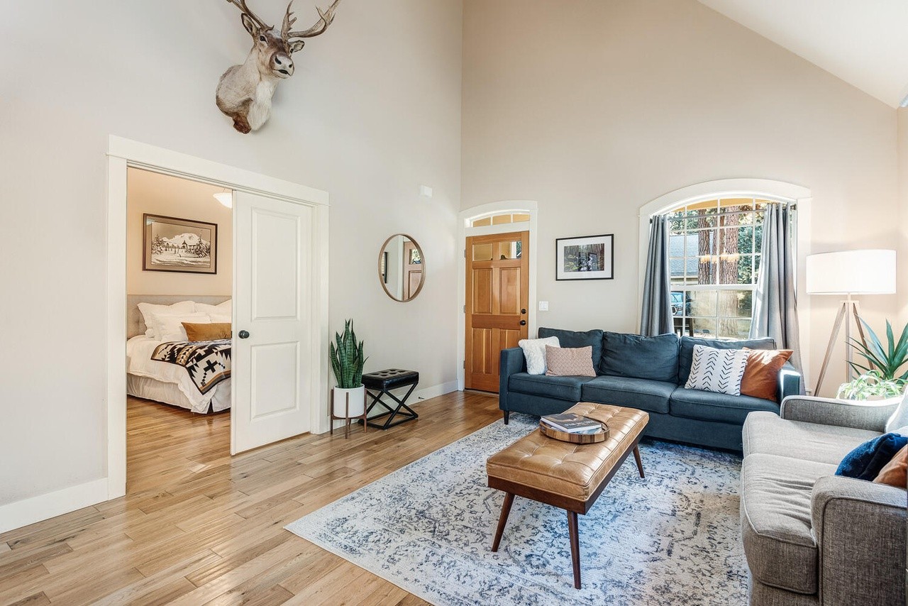 The main floor is anchored by the primary bedroom, a serene retreat with beautiful tall arched windows that bring in plenty of light. This suite is designed with simplicity and comfort in mind, featuring an ensuite bath with luxurious finishes and a spacious walk-in closet.