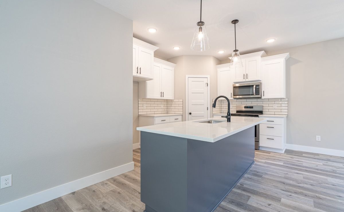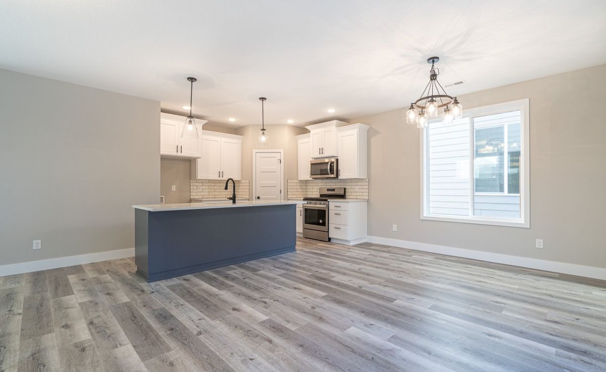 Taking a tour of the home, you’ll first start out in either the foyer or the garage (which opens up into the foyer). Straight ahead you’ll come to the heart of the open concept main floor: the kitchen/dining room/living room cluster. The dining room and the living room connect seamlessly, and the kitchen sits just in front. The kitchen has an easy and flowing L-shape that provides plenty of space for storage, food prep, and gathering.