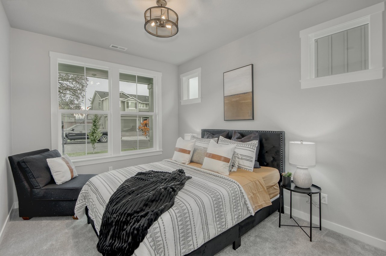 The upper floor houses all of the rest of the bedrooms. Up the stairs, you’ll first see the utility room, conveniently located for easy access for all upstairs rooms as well as the main floor suite. The three upstairs bedrooms are all similarly sized, however bedroom number four also includes a vaulted ceiling. Two sinks and a full size tub/shower round out the shared upstairs bathroom. Remember also that this is an Energy Star Home insuring energy efficiency that will pay for itself. This beautiful small farmhouse is also under construction and for sale by Stafford Homes In Pringle Creek