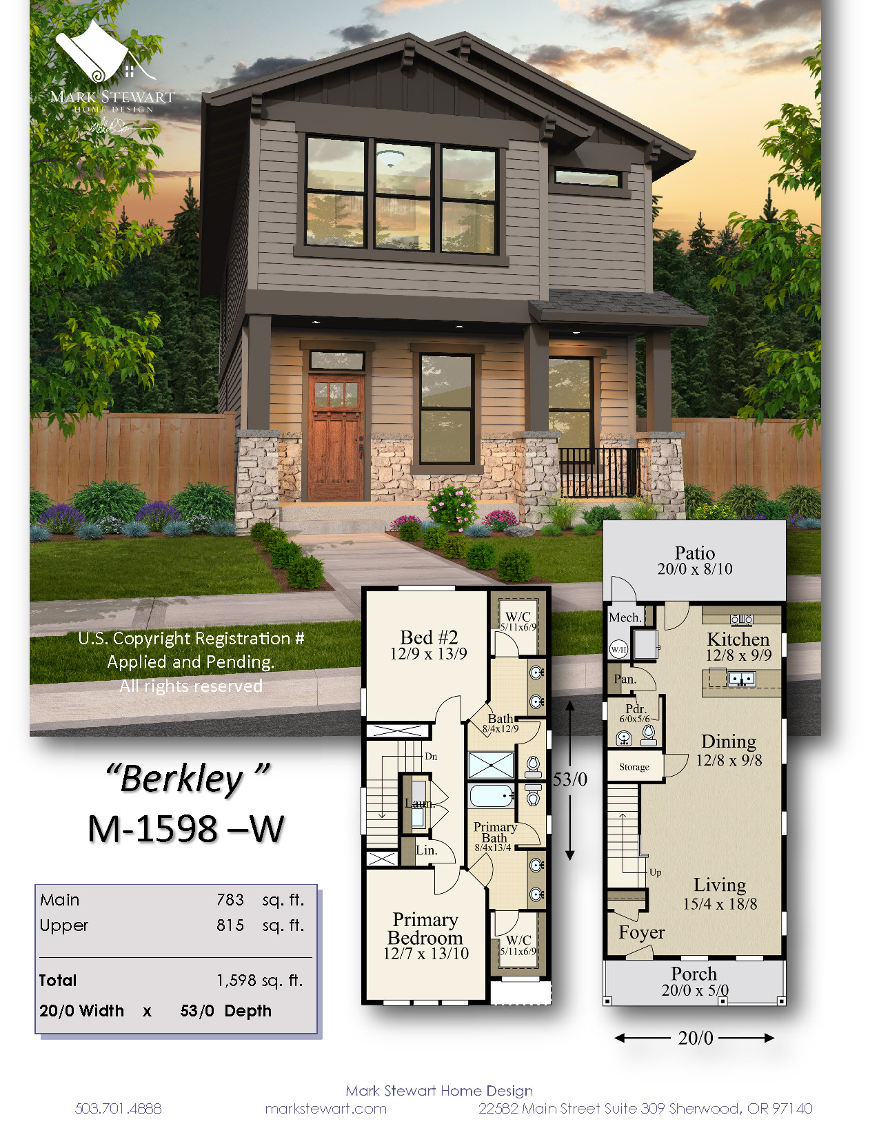 Berkley (M-1598-W) — A Compact Two Story Craftsman Home Designed for Narrow Lots