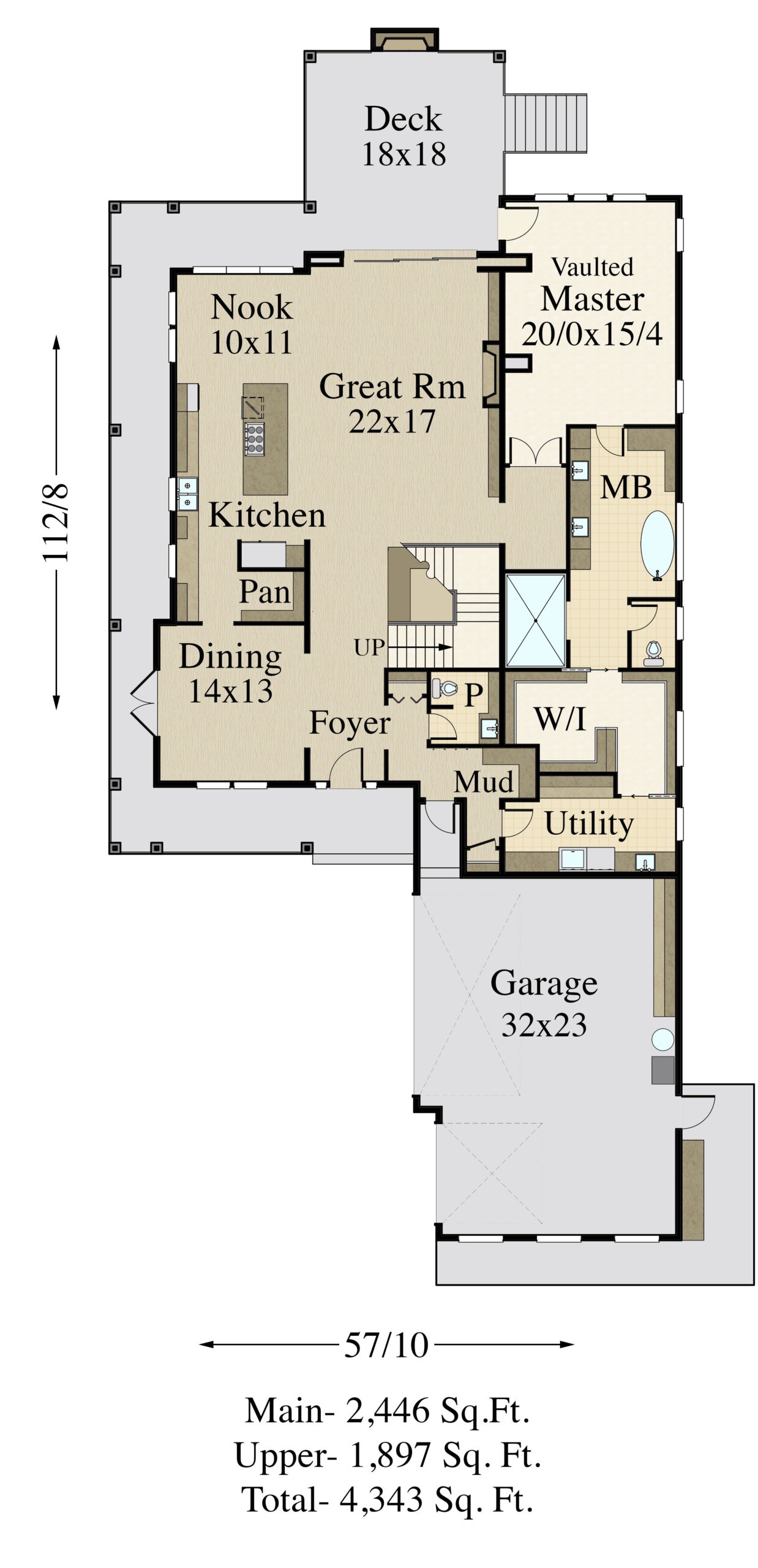We’ve pulled out all the stops for this stunning modern farm house. A strong yet inviting exterior welcomes you with all the stylistic touches that have made the farmhouse so beloved. You’ll immediately notice the wraparound porch, that extends from the garage all the way to the left side of the home. Here, we’ve included a large deck, a fireplace, and stairs that connect you to the backyard. Moving inside the home, there’s a fabulous dining room immediately to the left of the foyer. This opens up to the front deck so you can have breezy gatherings during the warmer months. Also through the dining room is direct access to the pantry and kitchen, further enhancing your ability to entertain and feed your family. The kitchen itself is in a sort of T-shape, with the back counter extending all the past the pantry, and the appliances on a separate wall across from the island. The great room, nook, and kitchen all come together to form an open concept space, a hallmark of the modern farm house style. The master suite gets tons of privacy as the only bedroom on the main floor, and we’ve made sure it’s spectacular. We’ve given you tons of space, a deluxe bathroom with a huge shower, standalone tub, and massive walk in closet, and, maybe best of all, easy access to the utility room through the closet. The upper floor is home to three additional wonderful bedrooms, a huge rec room, and a loft with it’s own laundry closet. Bedroom #4 is essentially a second master on the upper floor, as it has a massive walk in closet, separate tub and shower, and grand french doors. Back downstairs, a three car garage rounds out this modern farm house.
