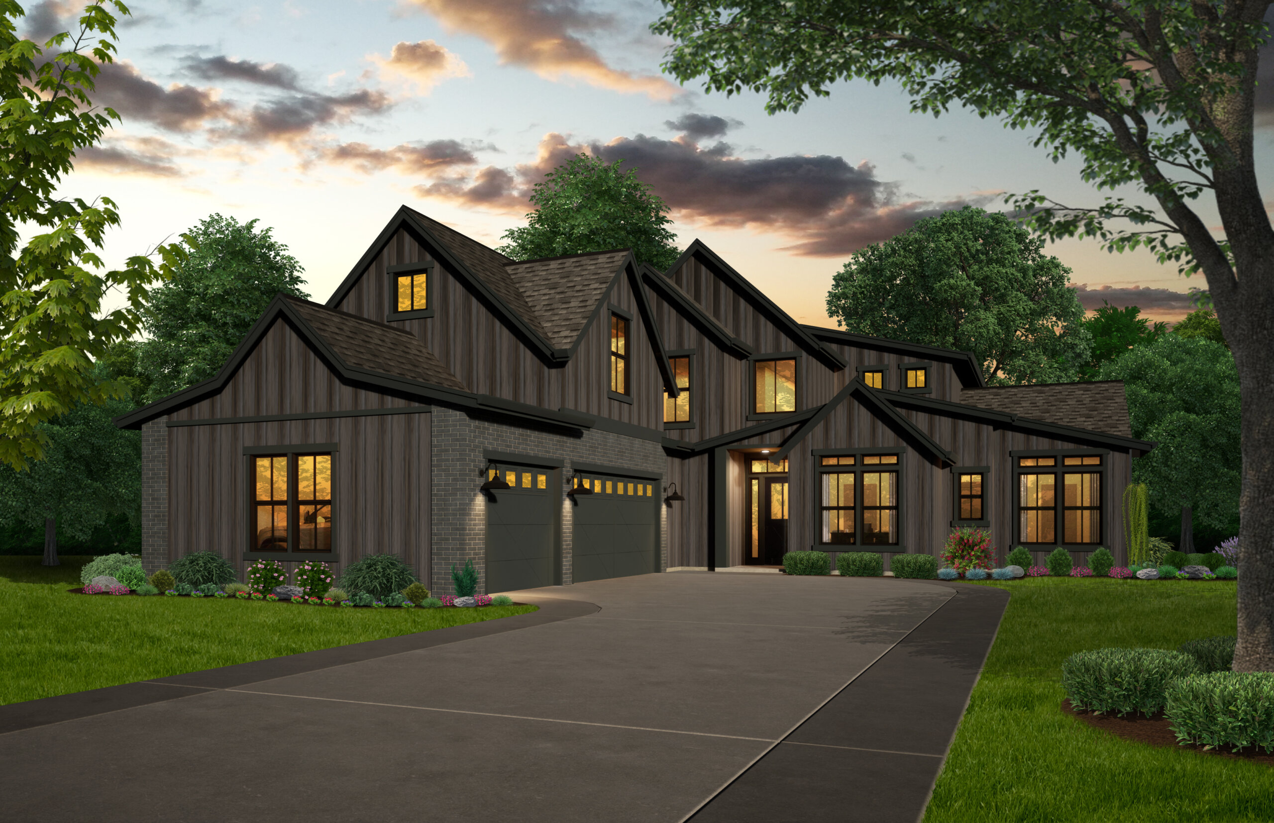Ironwood’s exterior brings rustic charm to life. With board-and-batten siding, painted brick, and timber details, it blends farmhouse tradition with modern edge. The three-car garage fits neatly into the design and includes side entry access for convenience.