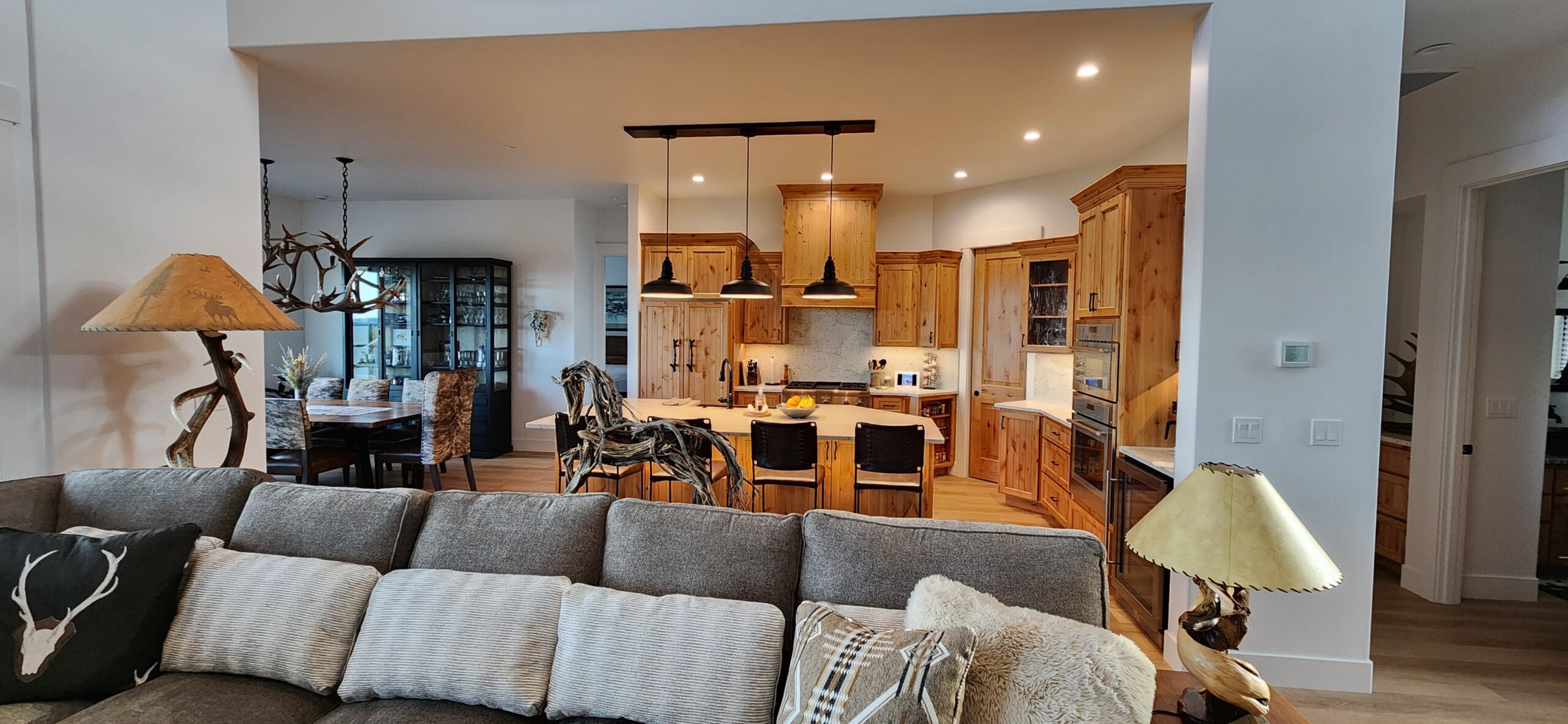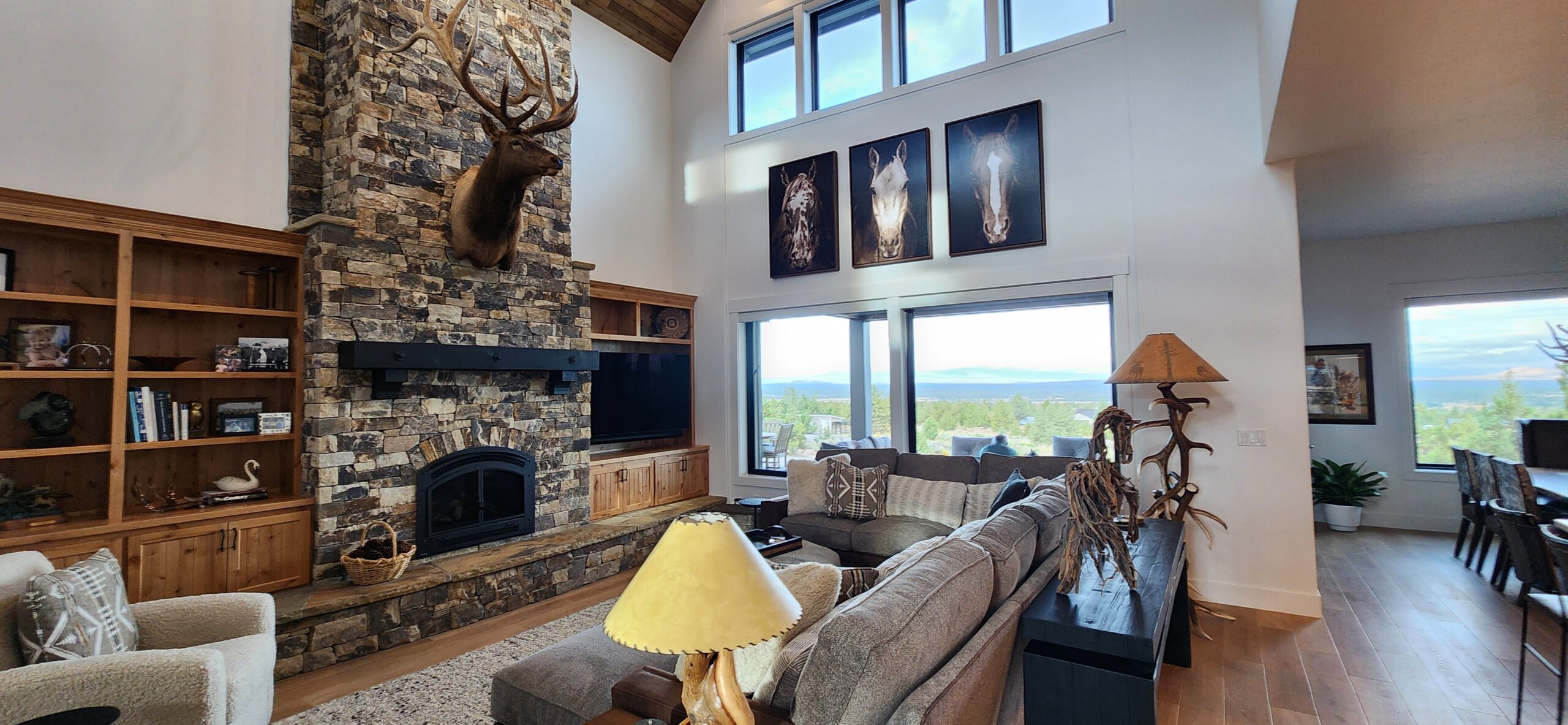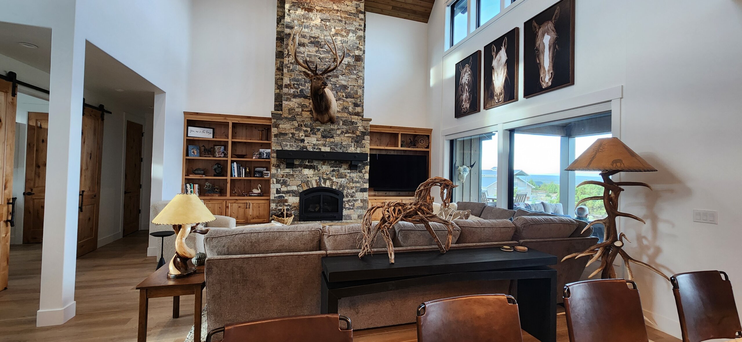A stone fireplace anchors the great room and creates a warm, inviting centerpiece. The vaulted ceiling adds height and drama, while the large windows connect you to the landscape beyond. As a result, the great room feels both grand and cozy — the perfect place for family gatherings or quiet evenings at home.