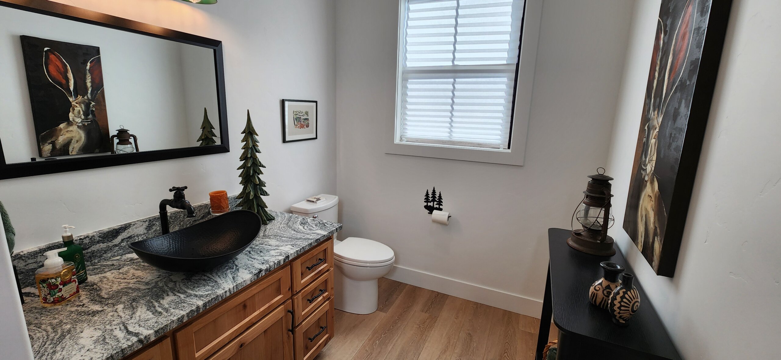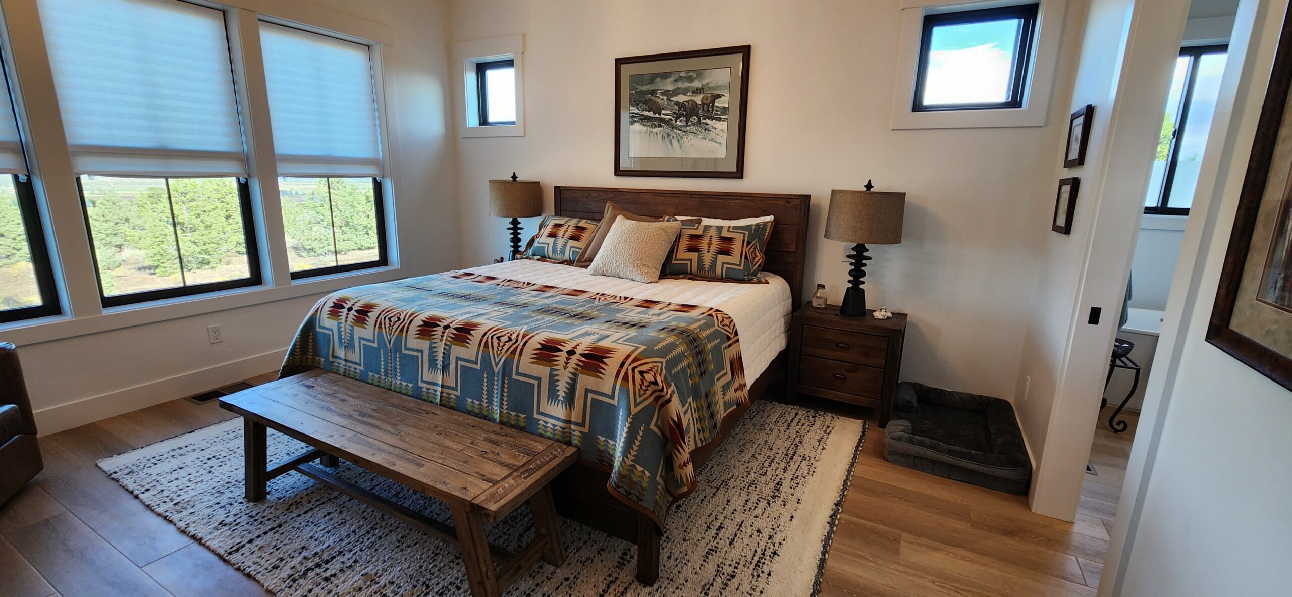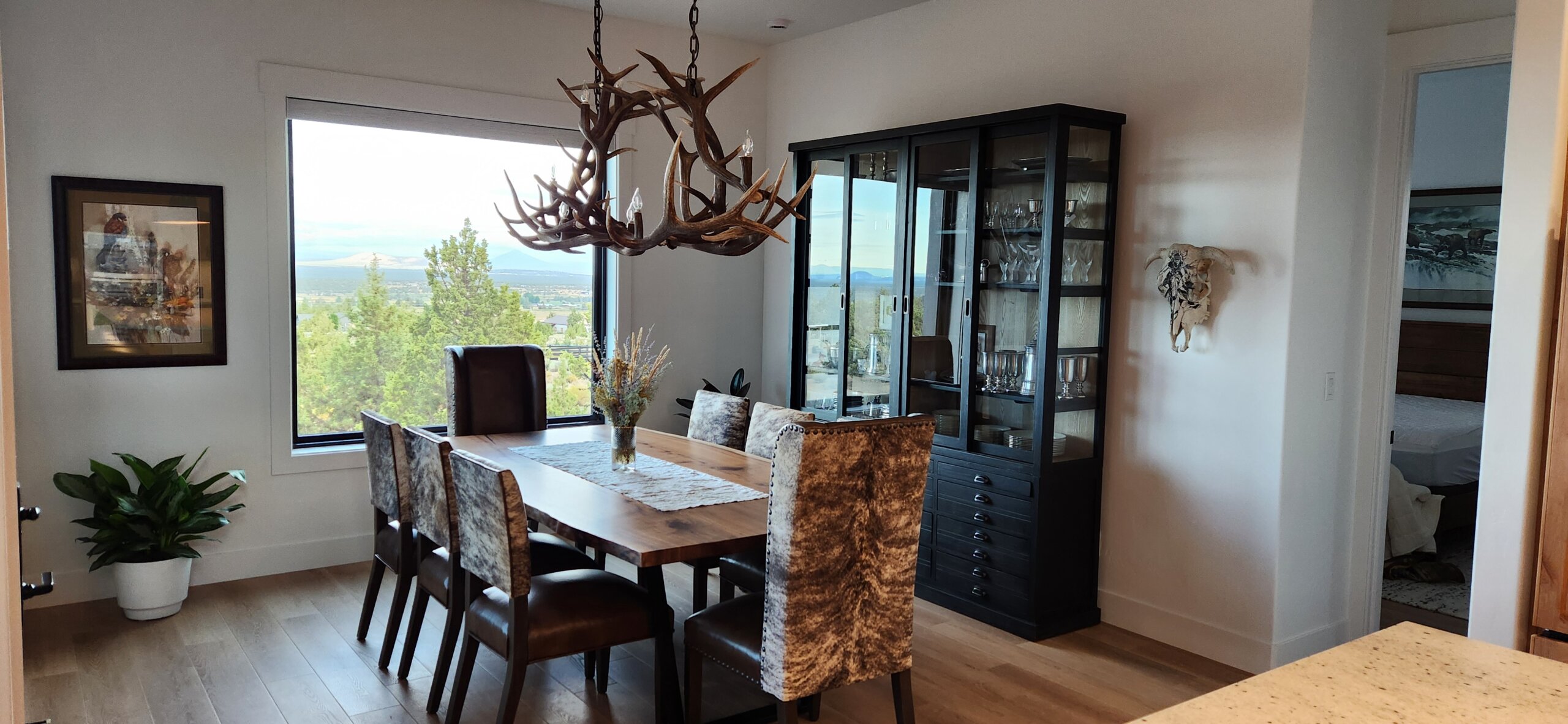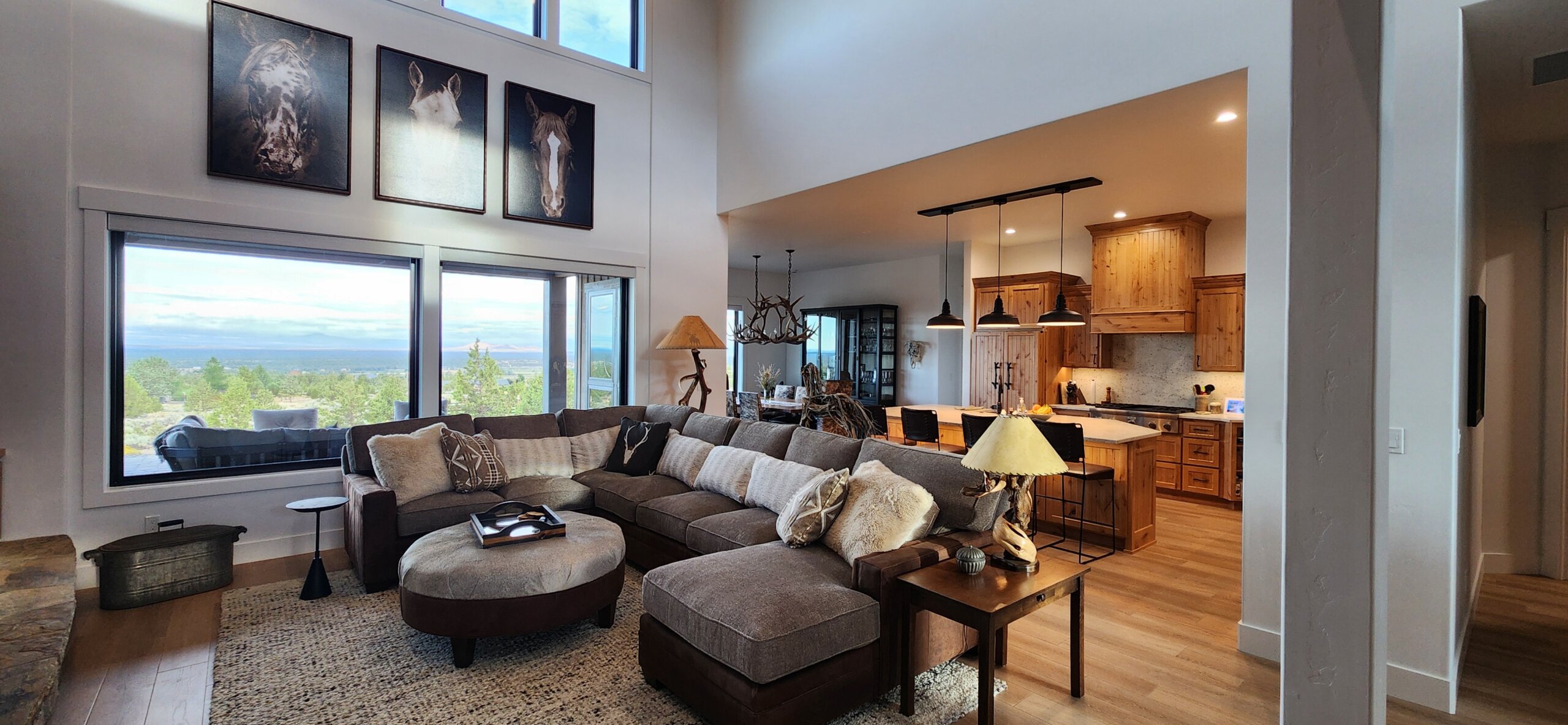 A stone fireplace anchors the great room and creates a warm, inviting centerpiece. The vaulted ceiling adds height and drama, while the large windows connect you to the landscape beyond. As a result, the great room feels both grand and cozy — the perfect place for family gatherings or quiet evenings at home.