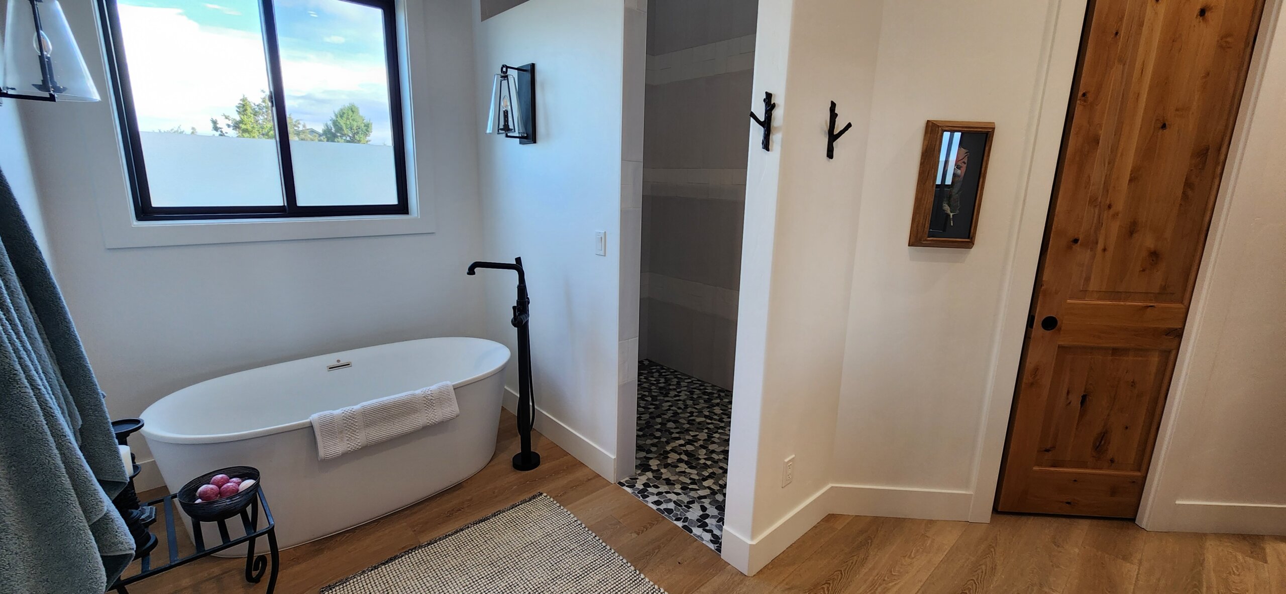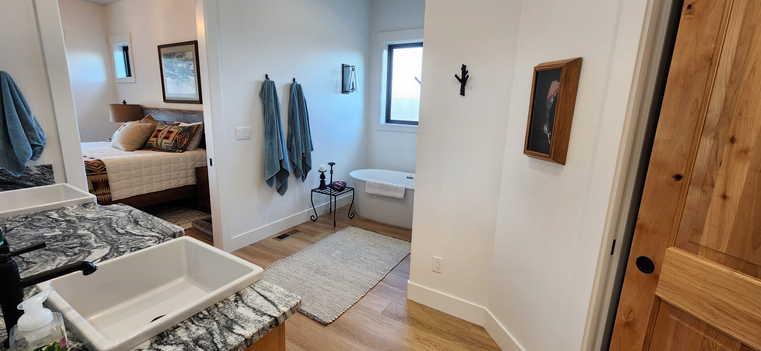 The primary bathroom feels like a personal spa. It includes dual sinks, a soaking tub, a walk-in shower, and a spacious closet. Every detail is designed for comfort and function.