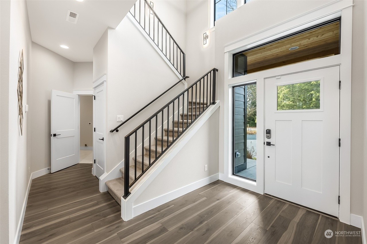 The master suite includes a vaulted ceiling, rear placement (allowing you to take full advantage of a rear view lot), and a bathroom complete with his/hers sinks, separate tub and shower, private toilet space, and a large walk-in closet. The main floor also includes two additional bedrooms, as well as a den that could easily function as a fourth bedroom with the adjacent powder room.