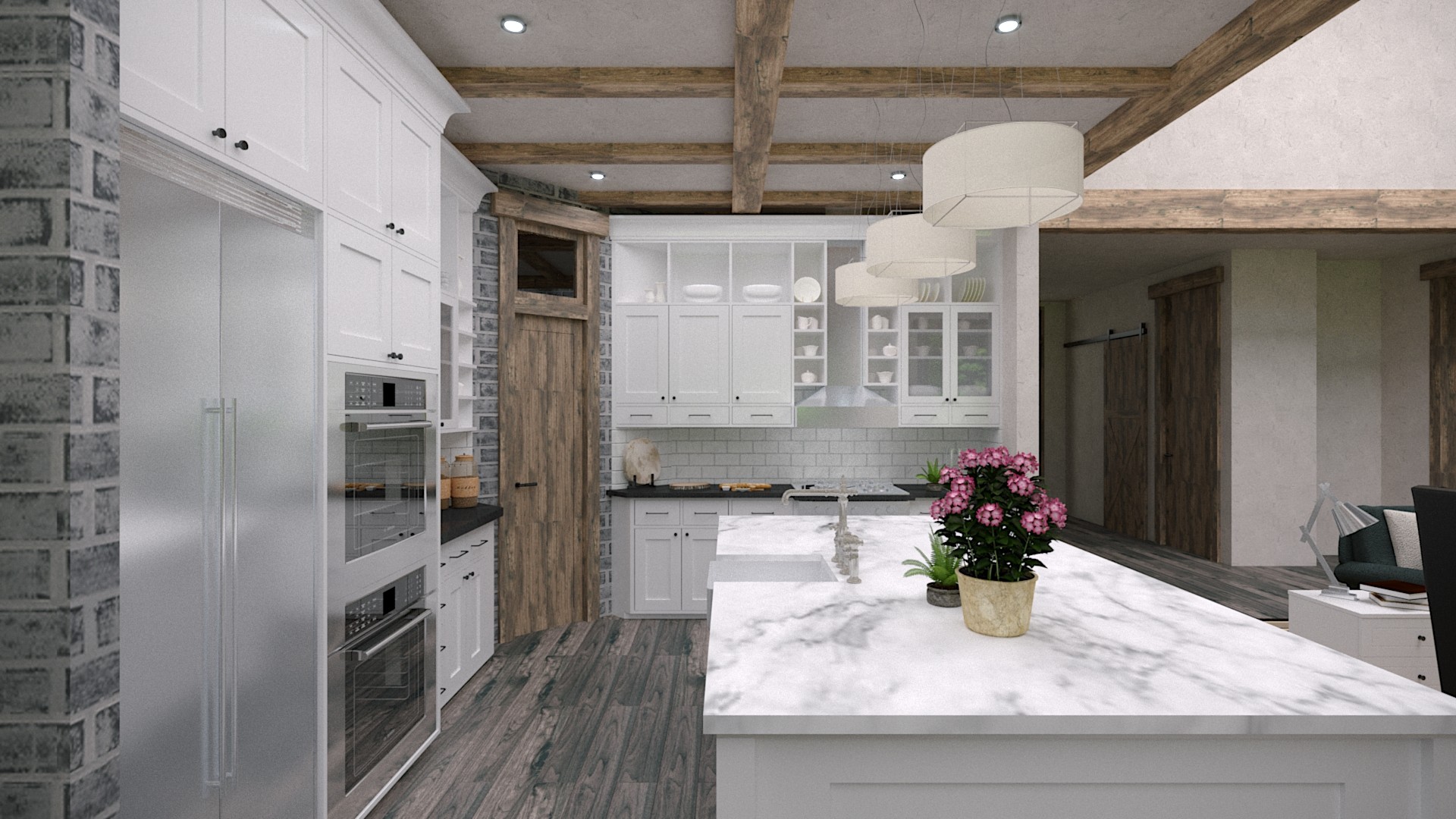 Pendleton sports an open and spacious interior, featuring an 18′ ceiling in the living room, outdoor living area with an 11′ ceiling, and an open concept layout incorporating the kitchen, living room, and dining room. The kitchen comes complete with a large island, walk-in pantry, and plentiful counter/prep space.
