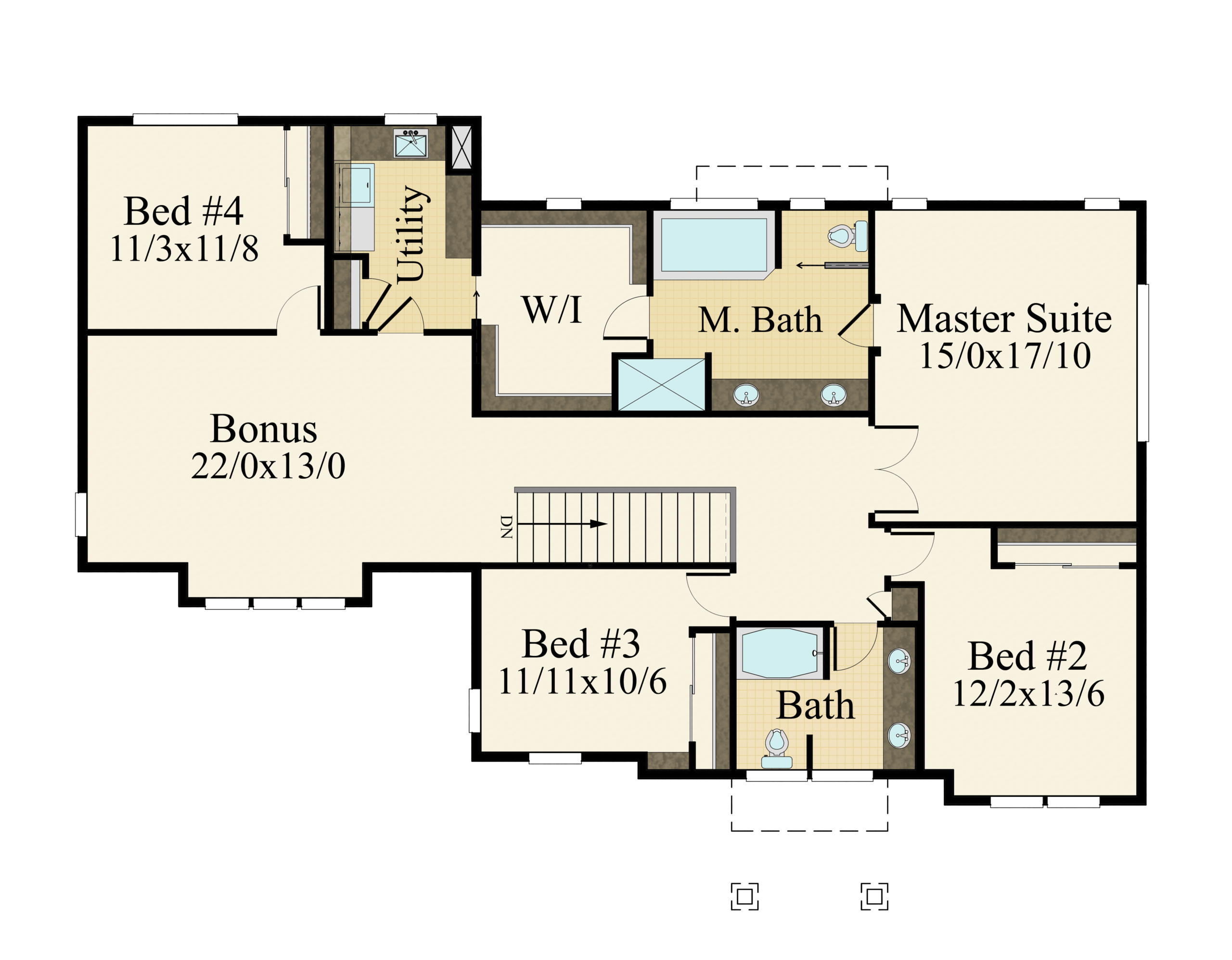 This home has a lovely transitional lodge/craftsman exterior, and we’ve created a unique and very livable floor plan to pair with it, resulting in a stunning two story home. The foyer leads you in to a semi-private dining room, which connects to a stunning great room with built-ins, a large fireplace, and plenty of windows. The kitchen has a generously sized island, an l-shaped countertop, walk-in pantry, and a nook that connects to the back deck. The two car garage is also accessed through the kitchen. Also on the main floor is a full bath as well as a flexible den that could easily work as a 5th bedroom. The upper floor is home to a massive bonus room, three spacious bedrooms, and a delightful master suite. Entering the master suite through a set of french doors, you’ll see the large view window out the side of the room. Continuing through to the master bath, you’ll see a standalone tub, separate shower, his and hers sinks, private toilet, a very generous walk-in closet, and perhaps the best feature of all, pass through access to the laundry, so your laundry can go straight from the closet to the washer and from the dryer back to the closet in one easy step.
