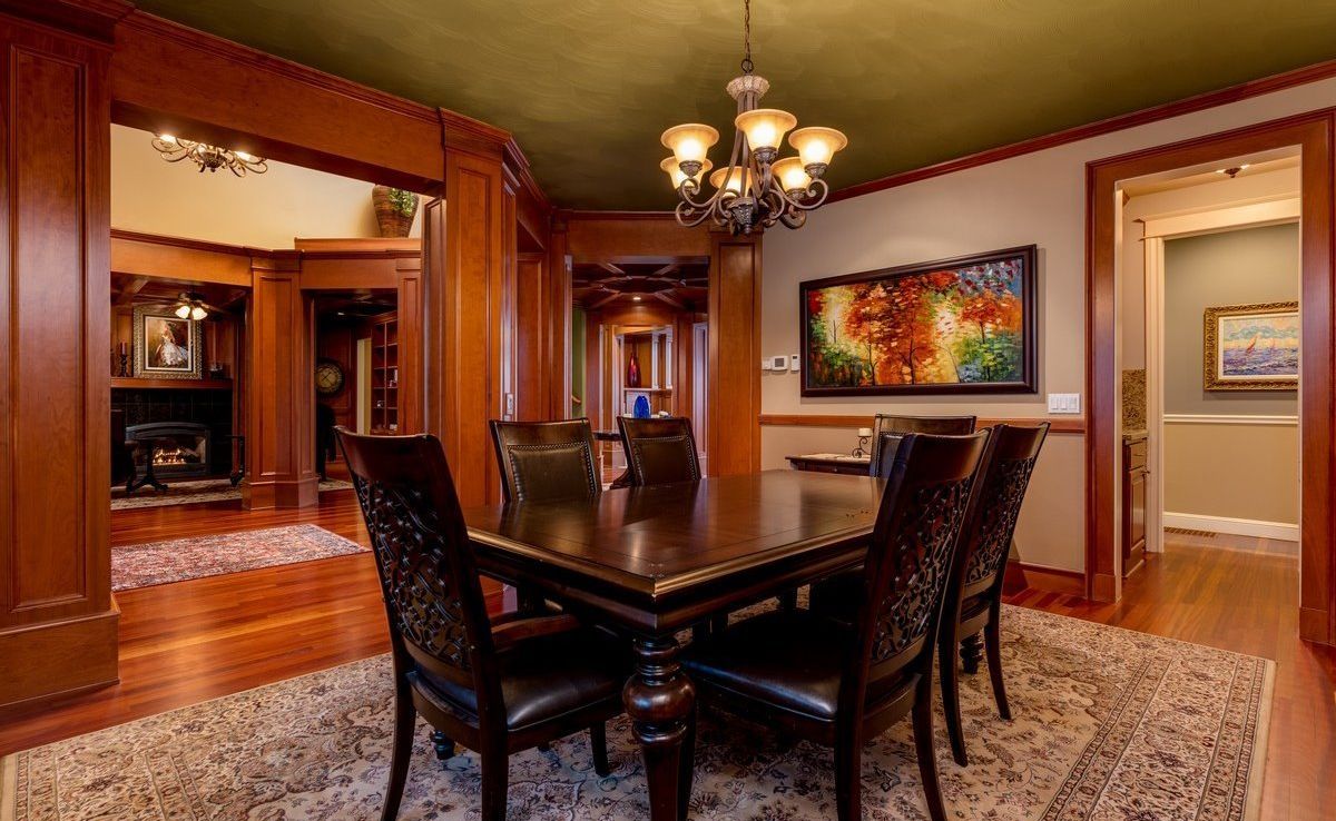 Skipping any further fuss, let’s take a look inside – starting with the vaulted foyer. Immediately upon entering the home you will be struck by the beauty and atmosphere of the entry. Two stunning rooms can be seen on either side of the foyer, with a warm and cozy library (complete with fireplace) to the left, and the formal dining room to the right. The beautiful grand hall acts as the portal to the rest of the home: straight ahead will take you to the vaulted great room and kitchen, left will take you either upstairs/downstairs or to the private main bedroom suite, and right will take you to the garage and guest bedroom.