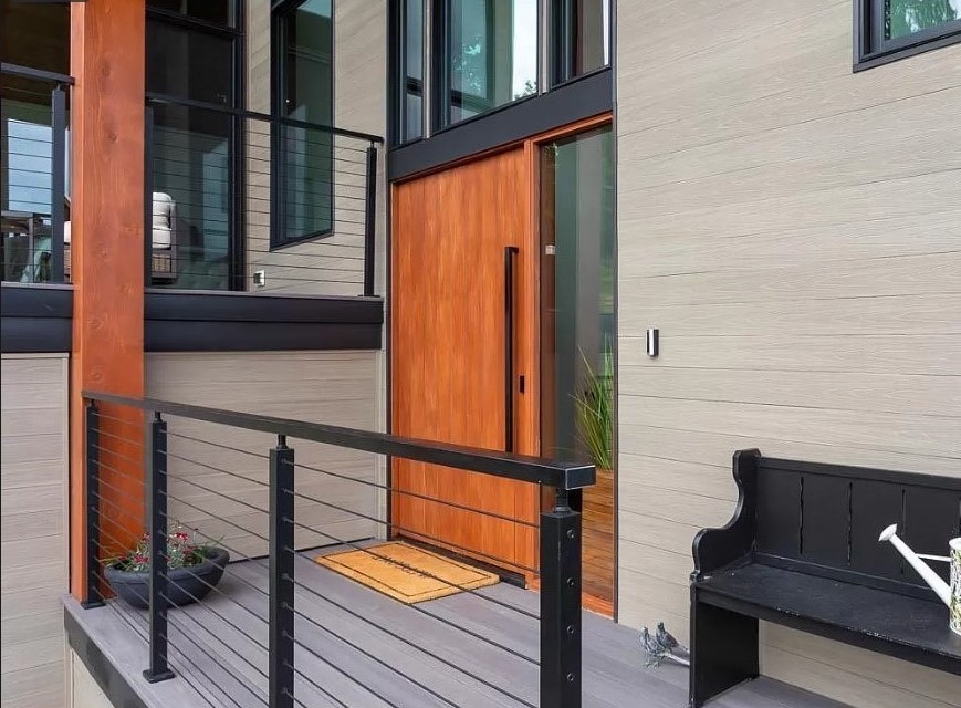 As you approach the house, a sleek, minimalist façade welcomes you with a combination of natural stone, glass, and steel. The clean lines and understated elegance of the exterior hint at the grandeur within. A wide, inviting pathway leads to the front entrance, where a generous door, framed by floor-to-ceiling windows, sets the stage for what lies beyond.