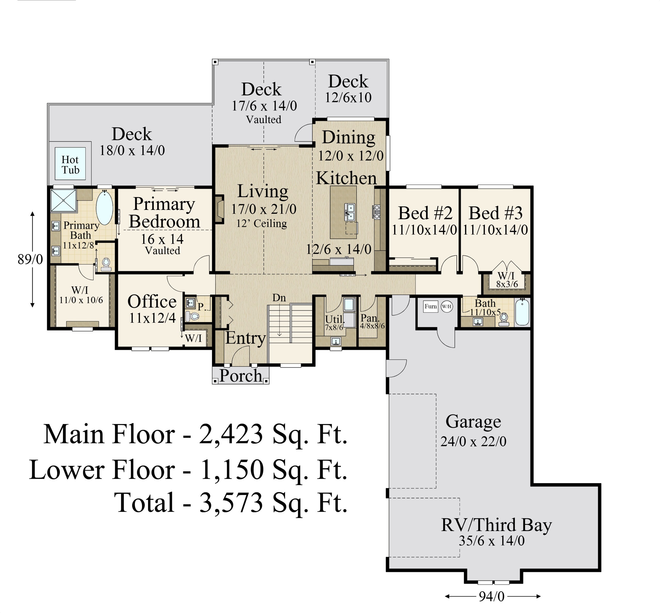 Revel in the beauty and function of this Rear View Lodge Home Design! Approach this beautiful Rustic Lodge Home Design from any angle and you will reel its grandeur and beauty. Designed as a Family Home Design with lots of flexibility, this plan has the best of everything. Delight in the Vaulted, open beamed Living Room that stretches out to the spacious yet intimate Outdoor Living Space. Private Owners quarters are zoned separately from the secondary bedrooms to maximize livability and privacy . A Vaulted Primary Bedroom with adjoining office is complimented by a full spa bathroom experience with large walk-in wardrobe and generous rear deck with hot tub out the back.