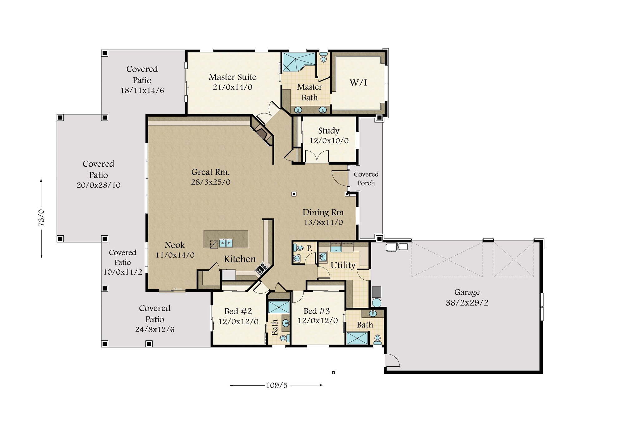 The luxurious master suite features a dreamy corner bathtub, double sinks, and a private restroom. The master is thoughtfully placed to the rear with many view windows and direct access to covered outdoor living, making this the ultimate retreat from the hustle and bustle of everyday life. On the opposite side of the home are two large secondary bedrooms each with their own bathroom, a spacious utility room, a convenient powder room, and the 3 car garage.