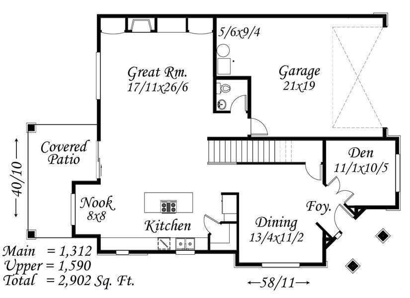 Traditional, Craftsman, and Lodge Styles, the Cornwall is richly detailed and an efficient house plan that’s perfect for a narrow corner lot. It features an open kitchen with expansive yet intimate great room, along with both formal and informal dining as well as main floor den. The corner entrance fits perfectly to the eye. Upstairs is a generous and well thought out Master Suite, along with big bonus room, two additional bedrooms and an upper floor utility room. Don’t overlook the large covered rear patio, off the breakfast nook.