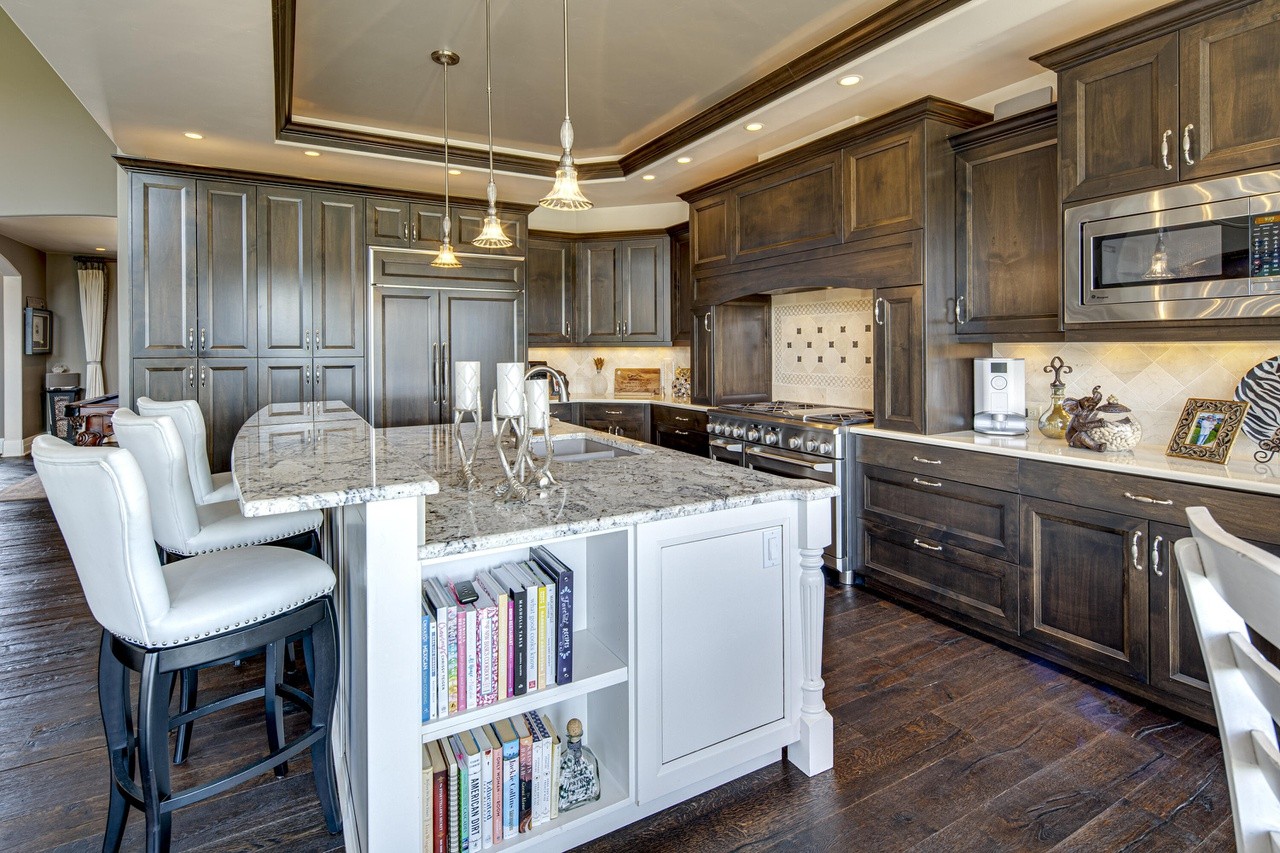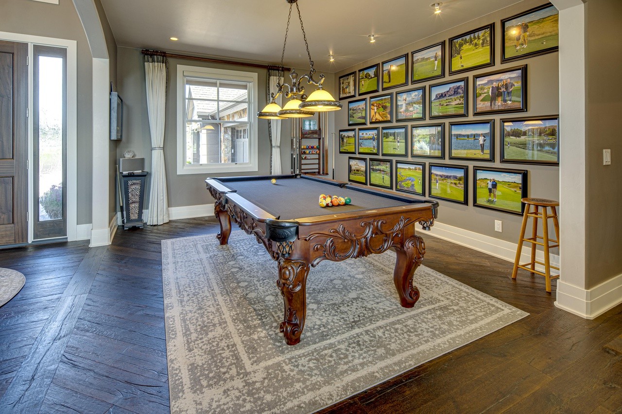 The kitchen features modern appliances, ample counter space, and a large island with seating for casual dining. The adjacent dining area can accommodate a large table for family gatherings or dinner parties.