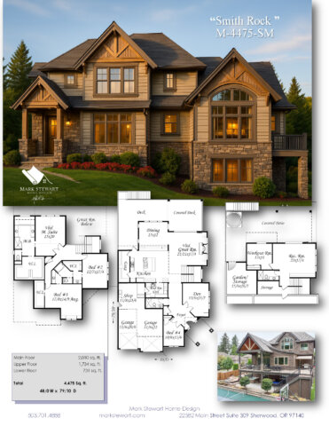 Smith Rock (M-4475-SM) is a stunning Old World Storybook House Plan that brings together timeless design and modern family function. With 4,475 square feet of well-planned space, this Transitional French Country home features a luxurious layout, elegant detailing, and broad appeal for homeowners and builders alike.