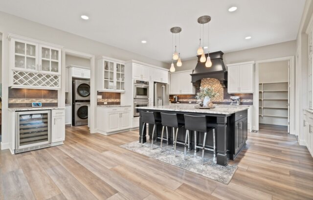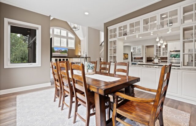 To the side, a wall of glass-front cabinets and a built-in sideboard offer extra storage and serving space. Behind the kitchen, a walk-through pantry connects directly to the mudroom and garage, simplifying daily routines and keeping clutter hidden.