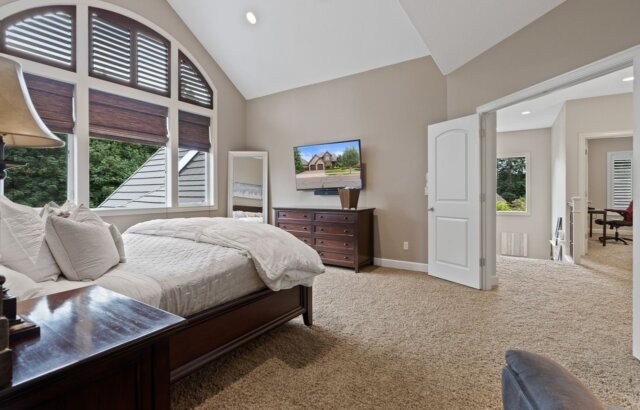 Upstairs, the primary suite serves as a luxurious retreat. Vaulted ceilings, generous windows, and ample space allow you to unwind with ease. The ensuite bathroom includes dual sinks, a freestanding soaking tub, a walk-in shower, and two large walk-in closets. As a result, this space feels more like a spa than a bedroom.
