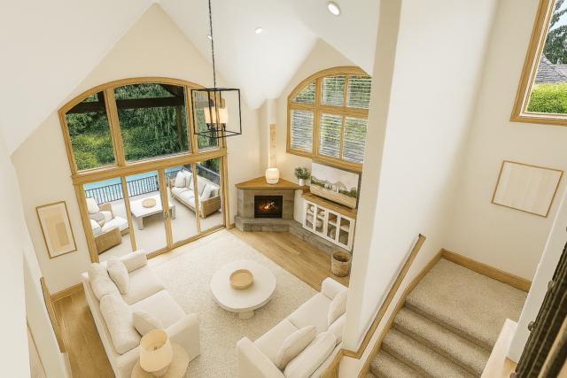 • Soaring butterfly-vaulted great room with fireplace and media wall