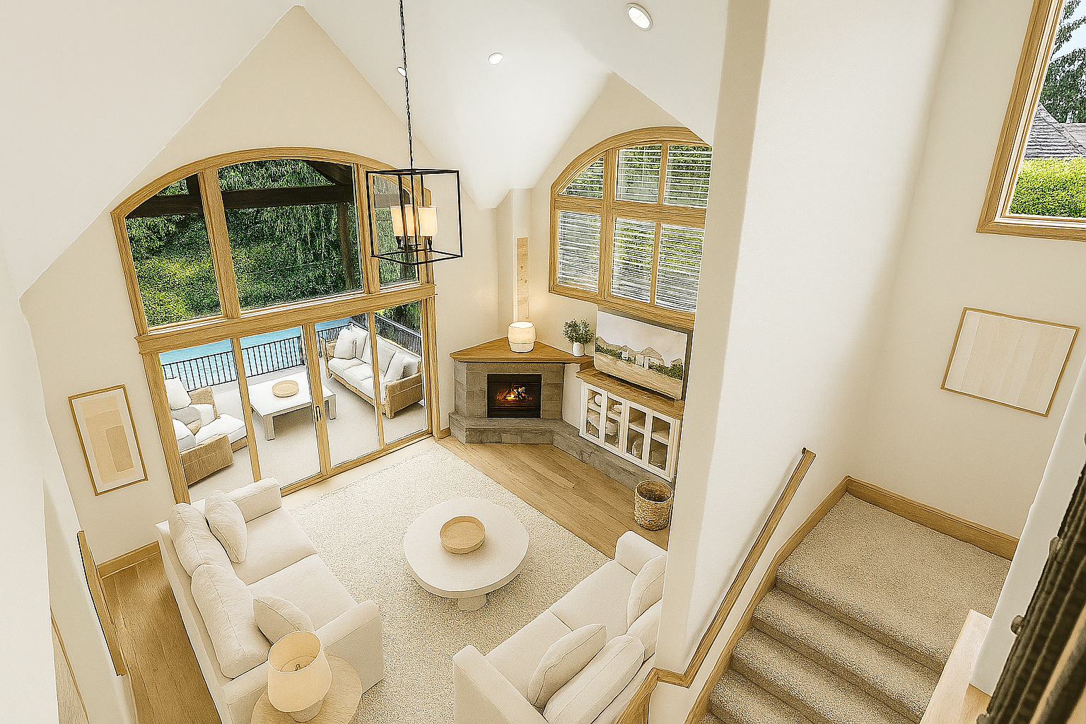 Thanks to the expansive ceiling and oversized windows, this room feels open yet intimate. It naturally becomes the home’s most memorable gathering space.