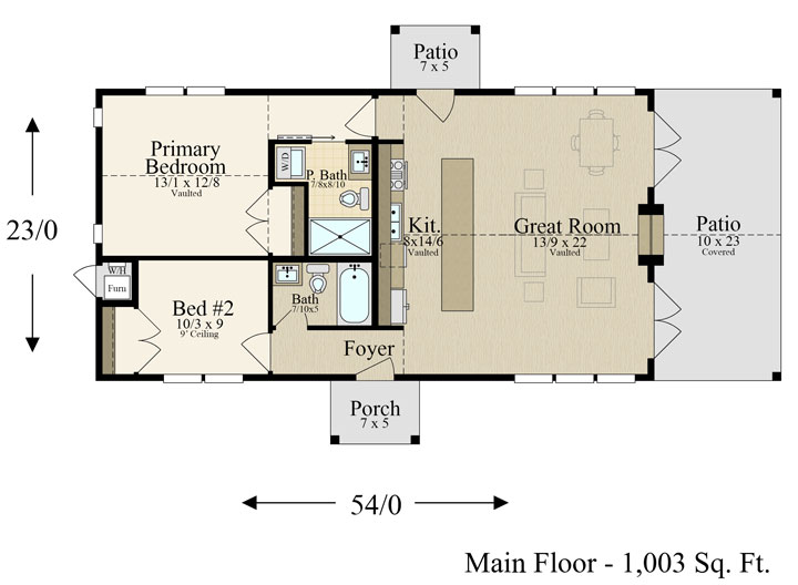 Its 23 ’ x 54’ footprint makes construction straightforward and affordable. Even so, the design feels rich and distinctive because of its bold roofline and open interior. For a small house plan this Modern Rustic One Story Beauty offers everything in a small package