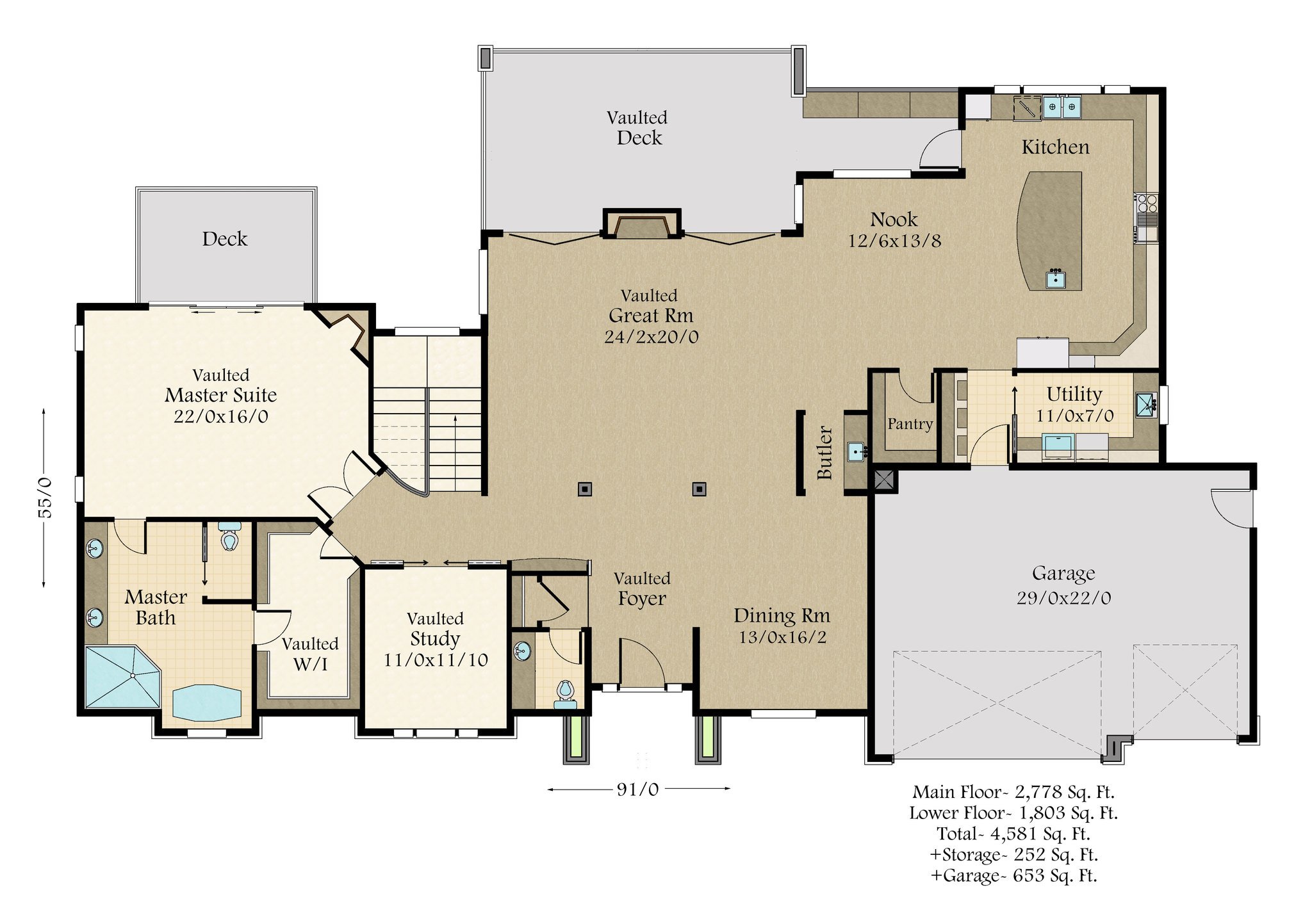 Enjoy luxurious living in this gorgeous luxury lodge house plan . The main floor houses a vaulted great room with dual doors to the vaulted deck at the rear of the home, a cook’s dream kitchen, complete with a large island in the middle, and a master suite featuring a fire place, private deck, and very generous vaulted walk-in closet, making this the ultimate peaceful retreat. The lower floor features a very large activity room, three spacious bedrooms each with their own walk-in closet, wine storage, and a fireplace. Don’t forget to check out the other homes in our extensive collection of lodge house plans.