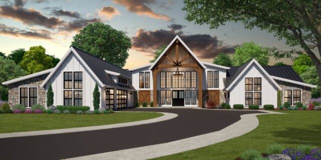 The Ultimate Barn Homestead (MB-2896) is a one story rustic family house plan that blends modern convenience with the warmth of barn-inspired architecture. This design captures the essence of relaxed rural living while offering every feature a modern family expects. At 2,896 sq. ft., with a wide footprint and a layout designed for flow, it’s a plan that balances elegance, function, and comfort in one unforgettable package. The epic achievement of light open volume spaces that are still intimate is rare, and has been accomplished in this special home design.