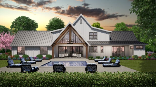 Curb appeal is the first thing you notice with this design. The home stretches across a 100-foot width, presenting a striking façade with steep barn gables, tall windows, and rustic siding options. Whether you choose reclaimed wood finishes, modern dark metal siding, or a mix of stone and board-and-batten, the architectural language is unmistakably barn-inspired yet refined for today’s neighborhoods.