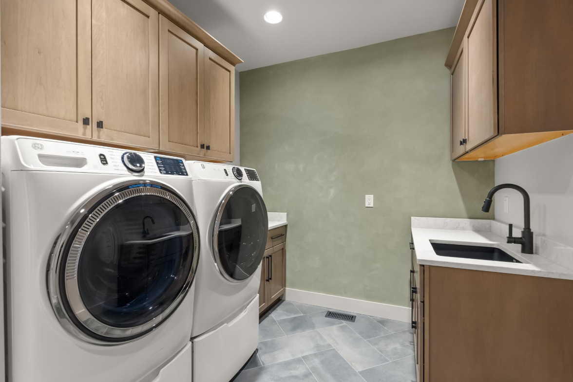The front porch, crowned with a two-story vaulted entry, welcomes family and guests with warmth. From the street, you also see the three-car garage and shop, offering both practical storage and hobby space. Pet owners will love the integrated dog wash station, a small touch that elevates daily living. Together, these elements create a home that feels welcoming, functional, and ready for generations of use.
