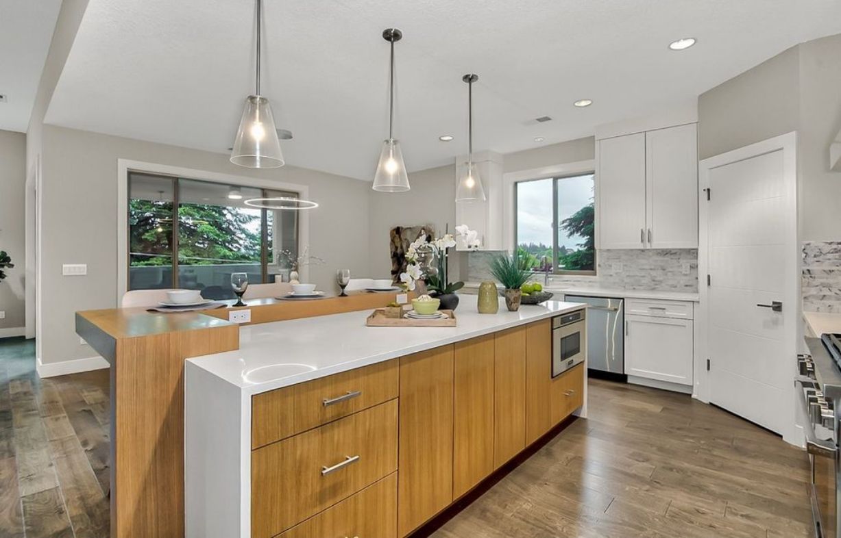 This custom design has all of the great features that comprise our signature northwest modern style. On the main floor of this home you will be welcomed by the 11 foot foyer which is flanked on the left by a large den/guest room, and on the right by a spacious dining room. Head through the foyer and past the staircase, and you arrive at the sprawling great room and kitchen, complete with massive island. The great room opens up to connect to a multi story outdoor living area, complete with outdoor fireplace.
