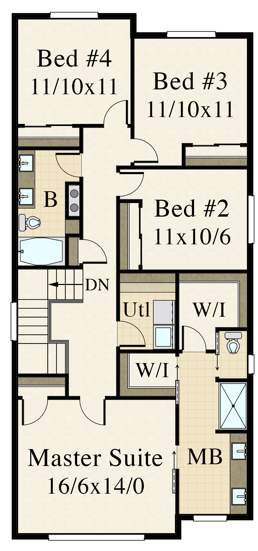 Moving upstairs, there are three bedrooms as well as a deluxe master suite at the front of the house. The master suite has everything you could want for clothing storage, with two separate walk-in closets and an additional closet inside the bedroom. In the master bathroom, you’ll find the toilet behind a pocket door, the walk-in closets, a large shower, and his and hers sinks. Just outside the master suite is the utility room, which makes laundry day very streamlined. The three bedrooms down the hall are all sized very similarly and share a large bathroom that has a combo shower/tub and two sinks. This home’s garage is oriented at the rear of the home, making it an easy choice for a subdivision of row houses.