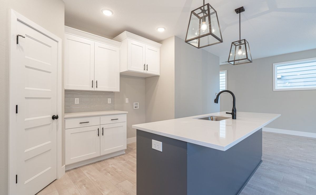 Looking at the floor plan, you’ll first start out in either the foyer or the garage (which opens up into the foyer). Straight ahead you’ll come to the heart of the main floor: the open concept kitchen/dining room/living room cluster. The dining room and the living room connect seamlessly, and the kitchen sits just in front. The kitchen has an easy and flowing L-shape that provides plenty of space for storage, food prep, and gathering.