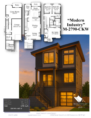 Modern Industry is a brilliant example of a Modern Three Story House Plan specifically crafted for narrow lots. With only 23 feet of width, this 2,790 square foot home delivers livability, comfort, and architectural style in an efficient footprint. Designed to fit seamlessly into urban and suburban neighborhoods, Modern Industry blends bold modern curb appeal with highly functional interior spaces.