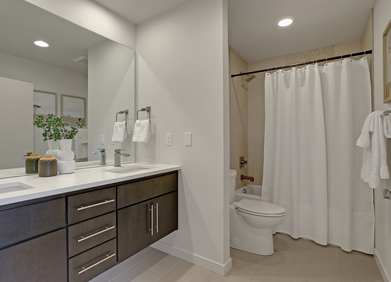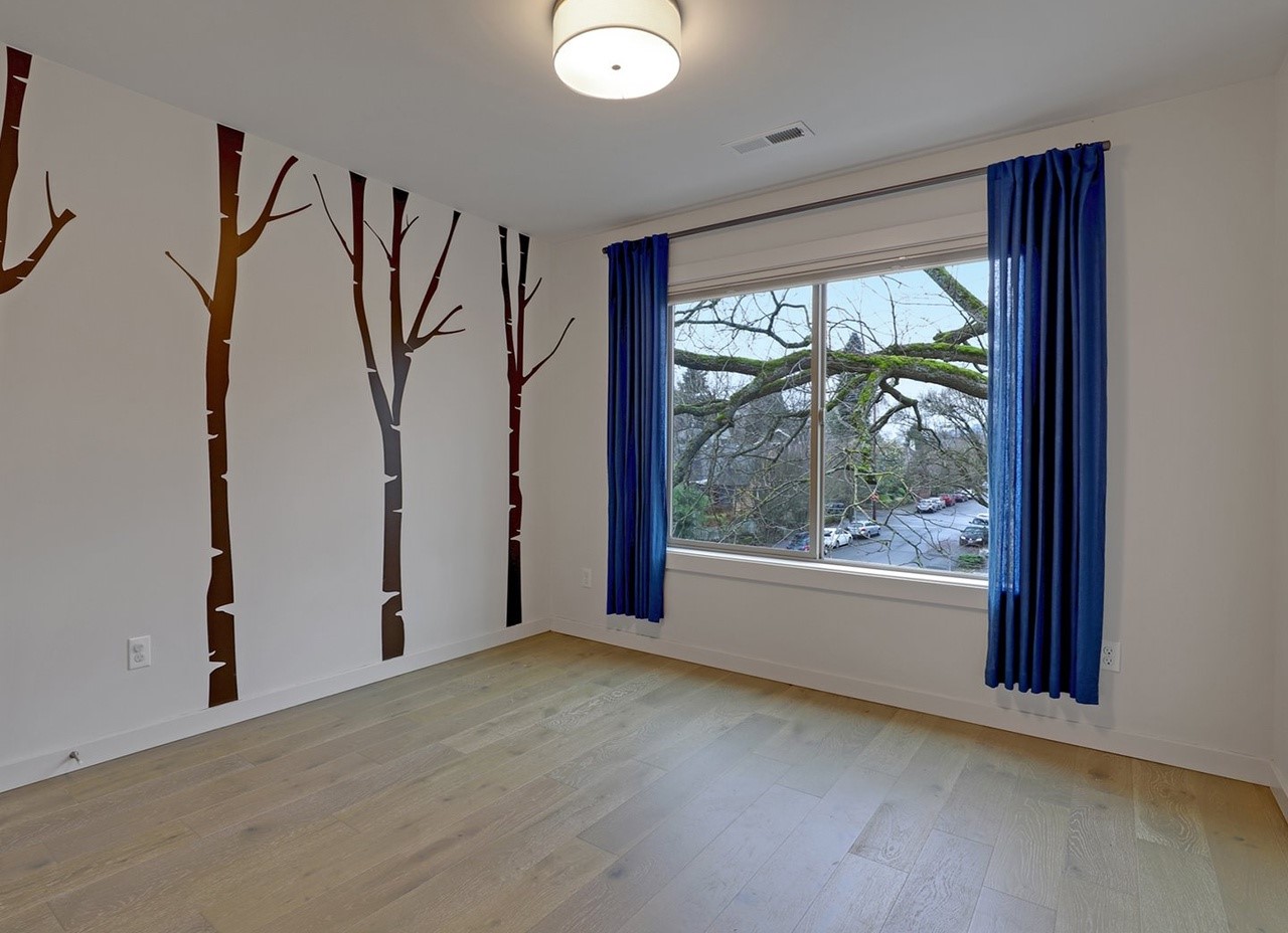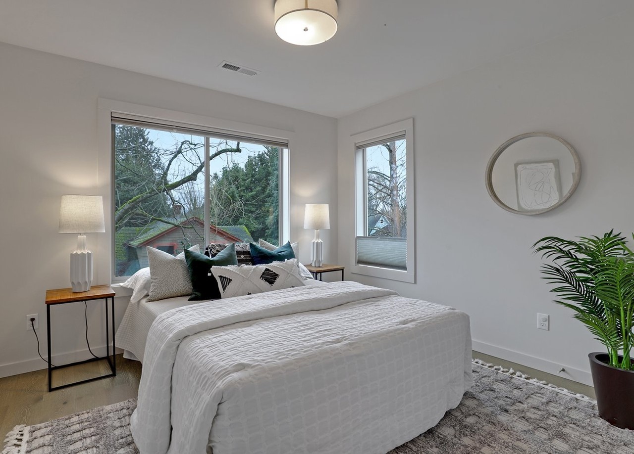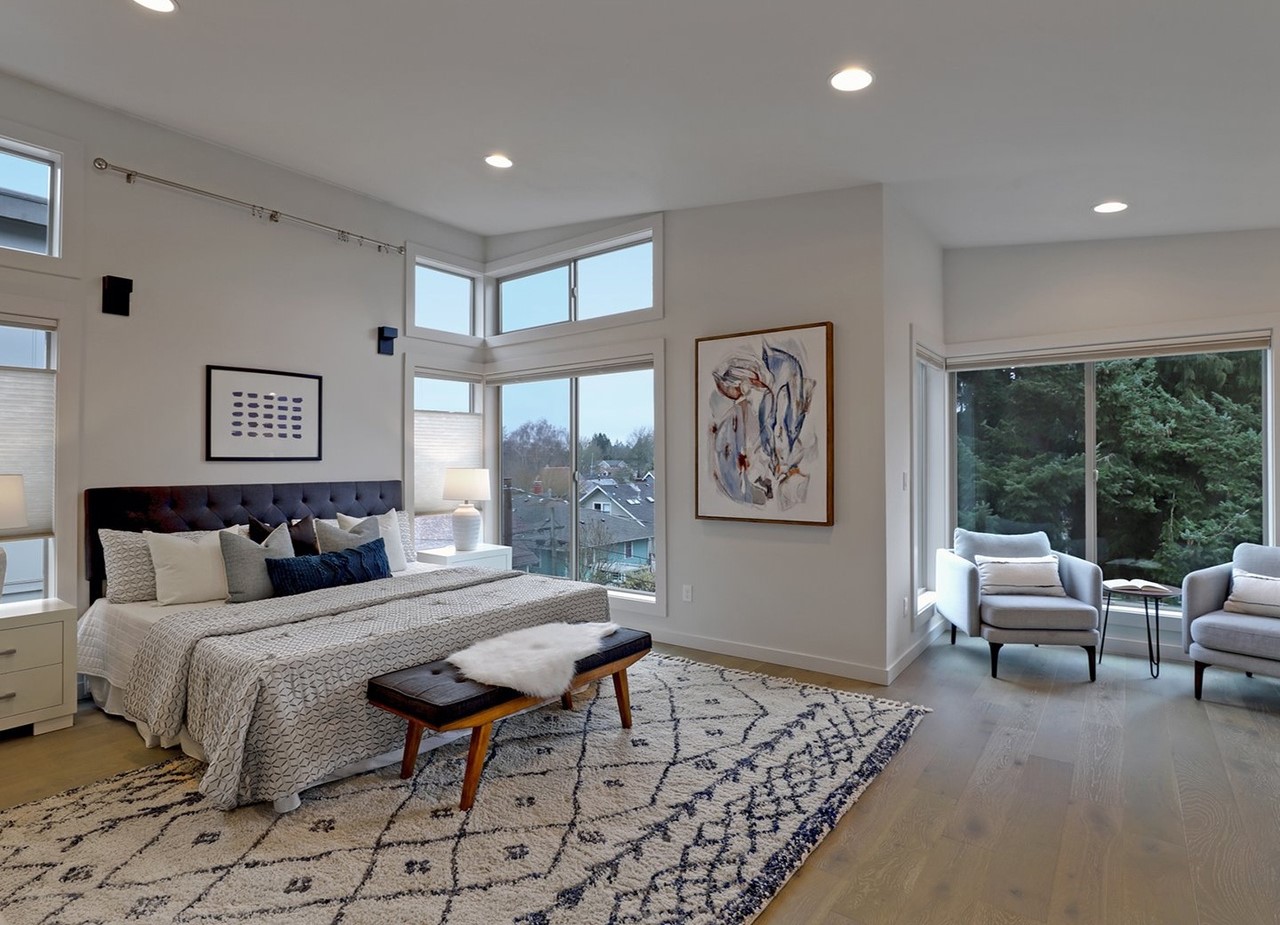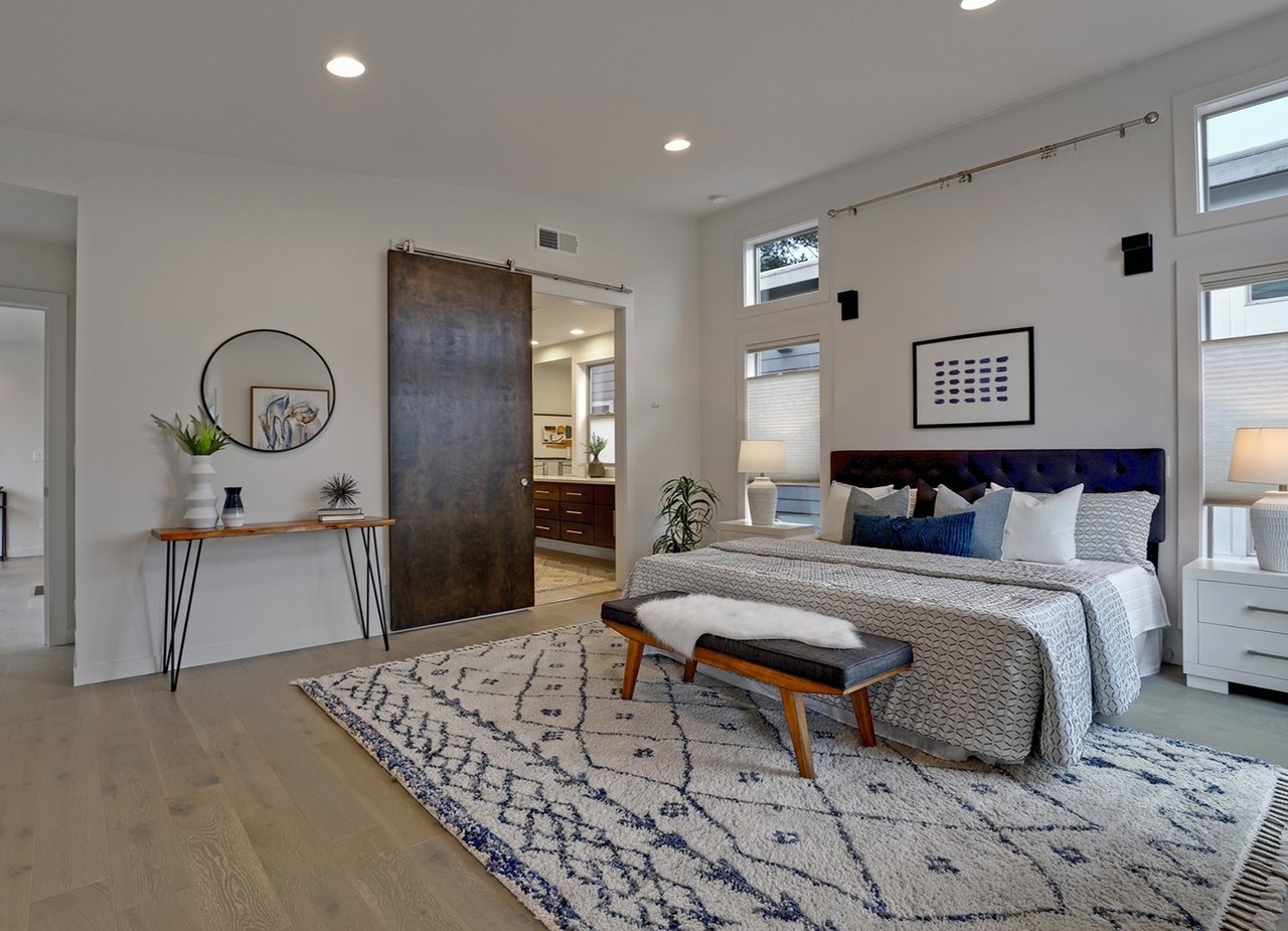 The upper floor of Modern Industry is designed to offer privacy, comfort, and function for family members. The primary suite occupies the entire rear portion of the home, featuring large windows, a private yoga or sitting area, and a luxurious en suite bath. Dual vanities, a soaking tub, walk-in shower, and barn-door separation make the owner’s suite feel like a private retreat.