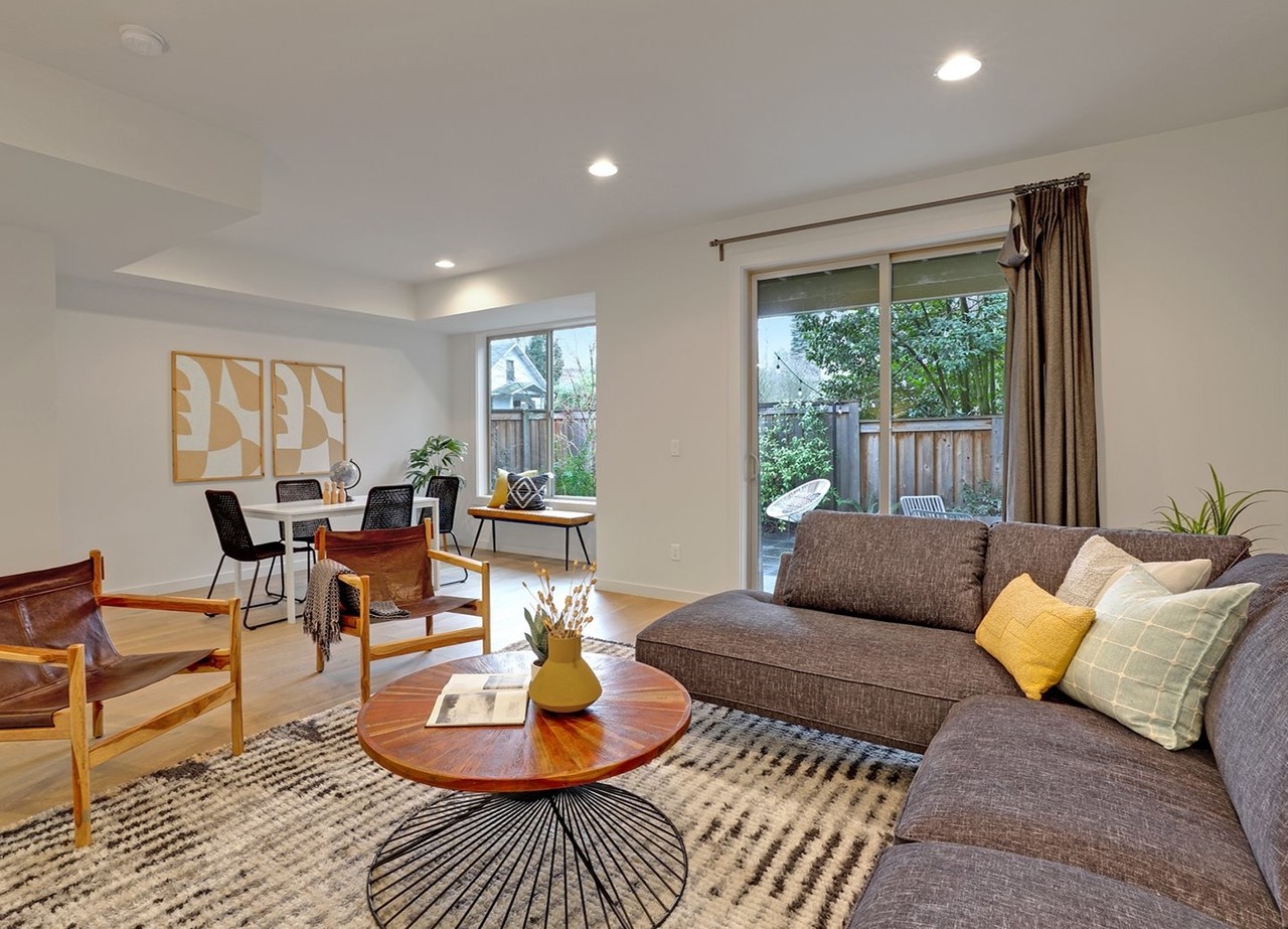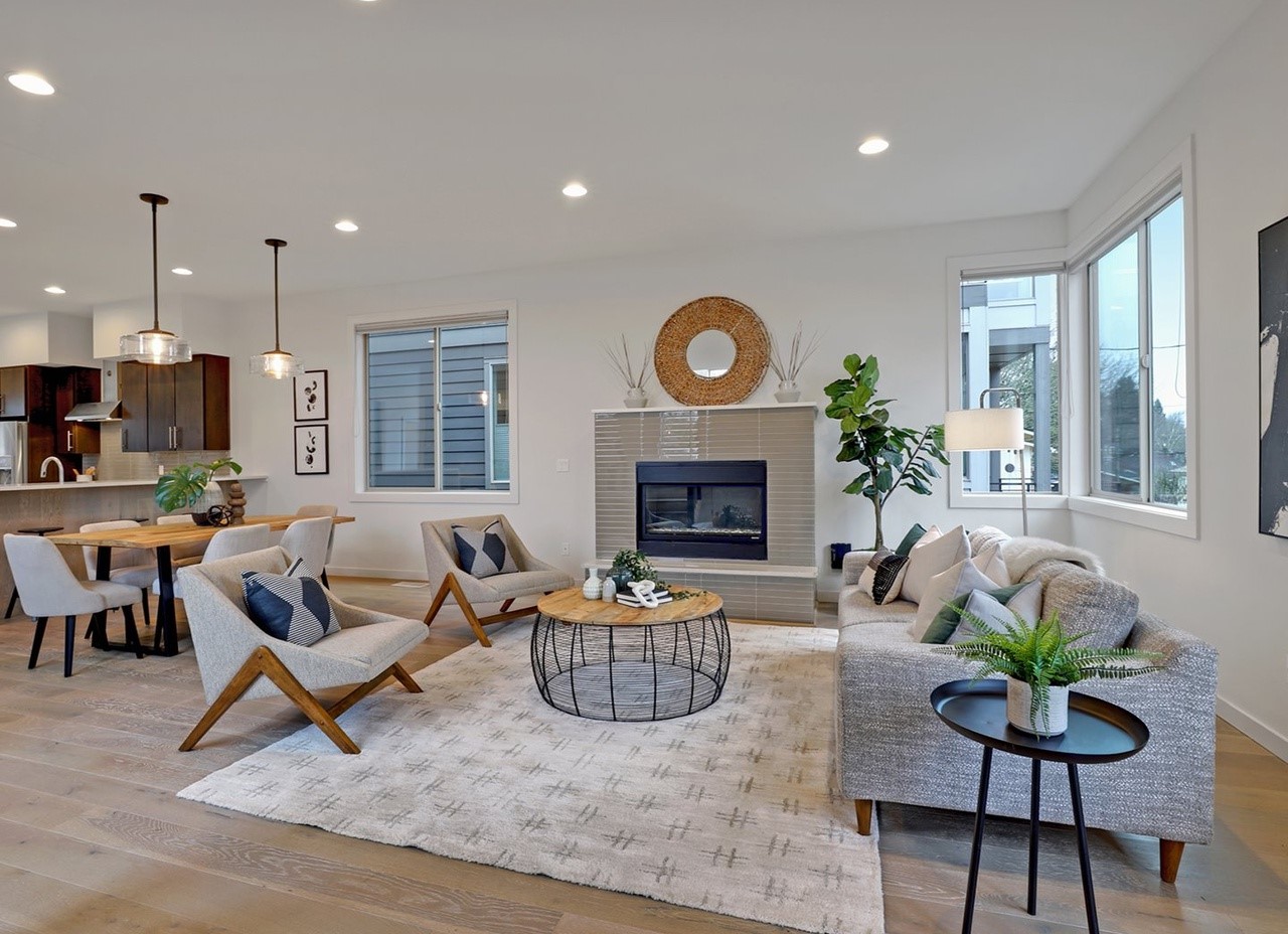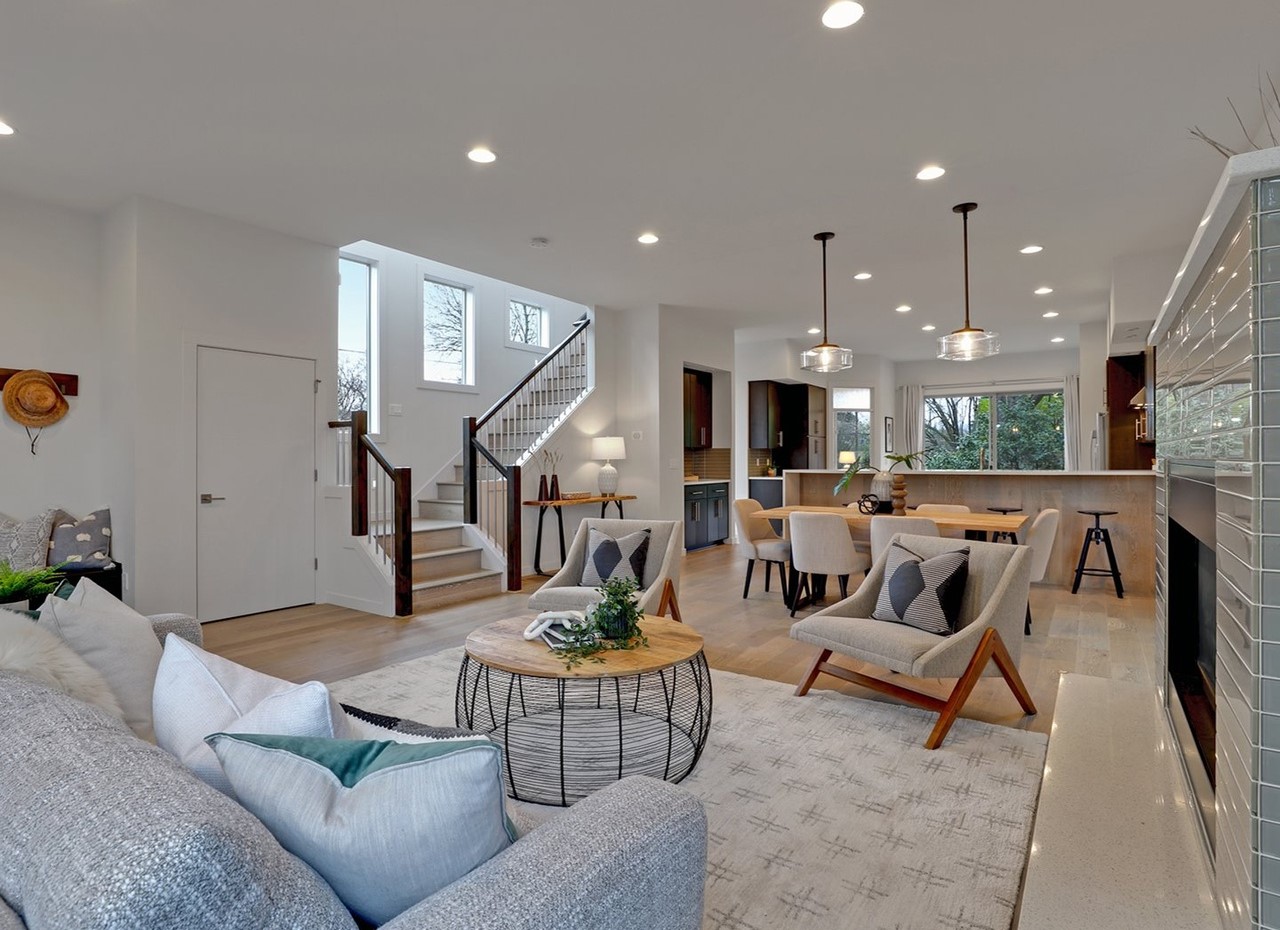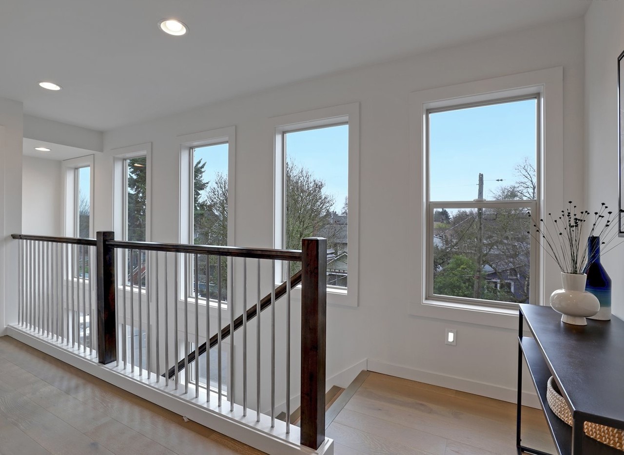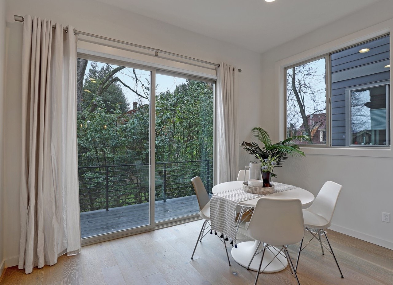 The second level of Modern Industry serves as the primary living space. This floor features a completely open concept design that allows for effortless flow between the living, dining, and kitchen areas. Large windows on both the front and rear bring in abundant daylight, while the side-mounted deck extends the usable living space outdoors.