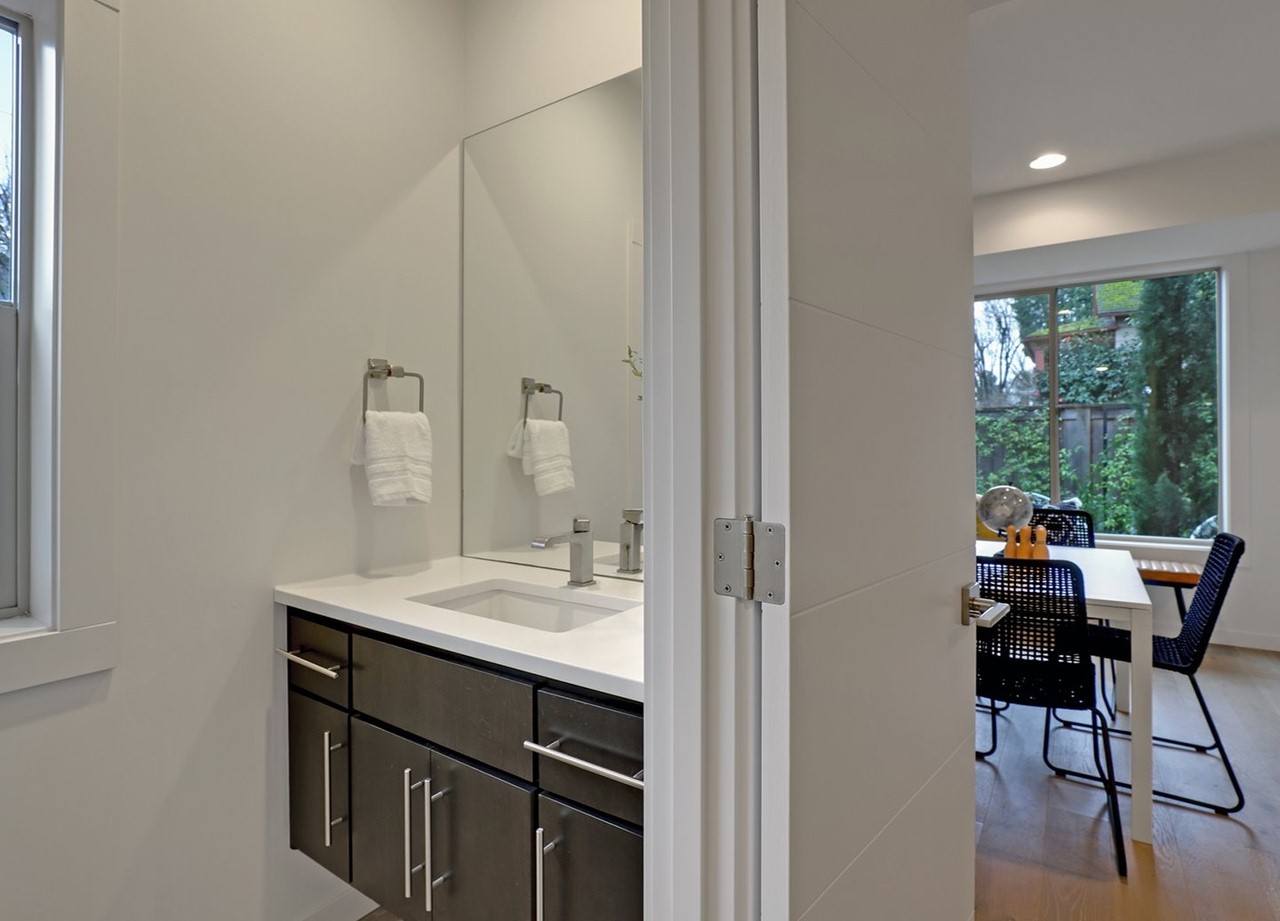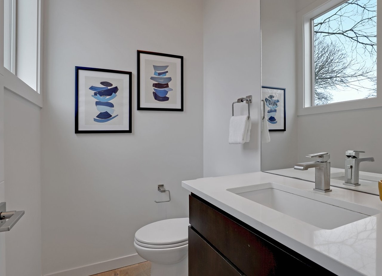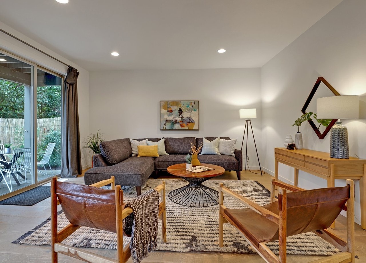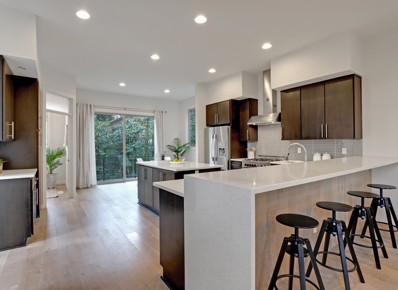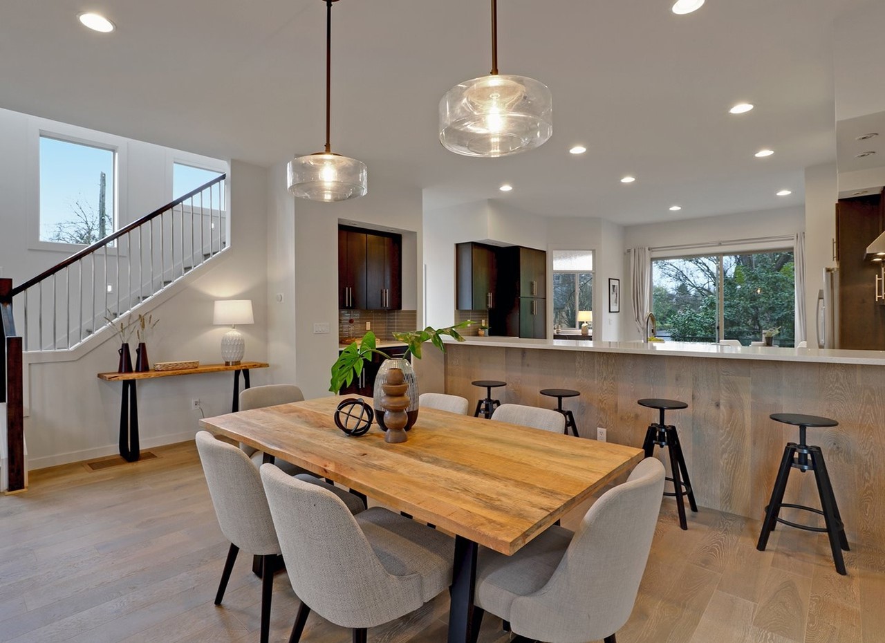 The second level of Modern Industry serves as the primary living space. This floor features a completely open concept design that allows for effortless flow between the living, dining, and kitchen areas. Large windows on both the front and rear bring in abundant daylight, while the side-mounted deck extends the usable living space outdoors.