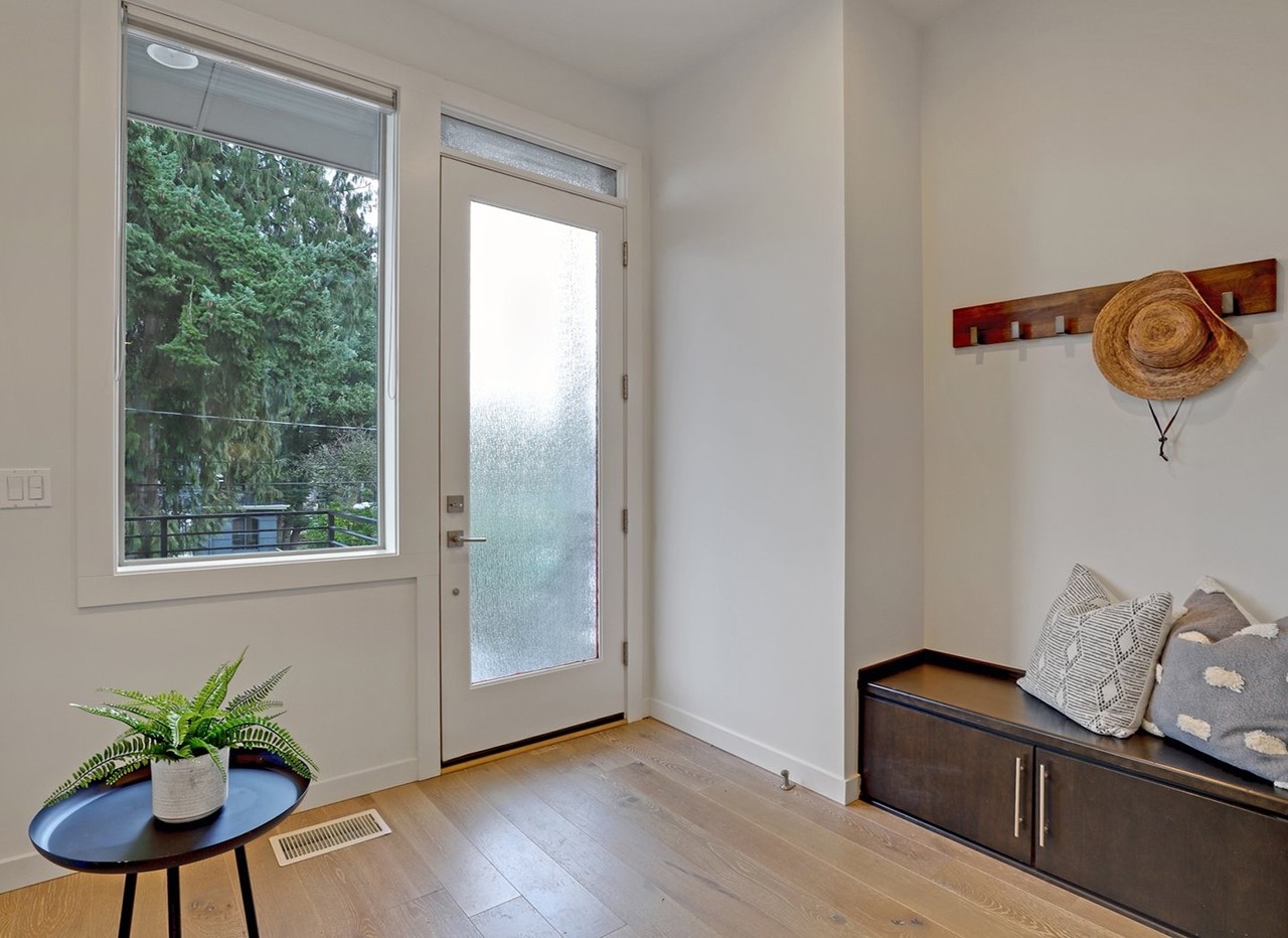 A small private den located off the nook area provides additional flexibility. Whether used as a home office, reading room, or hobby space, it adds valuable function to the main floor. A conveniently located powder bath serves the entire main floor, while an inviting entry foyer welcomes guests with a built-in bench and practical coat storage.