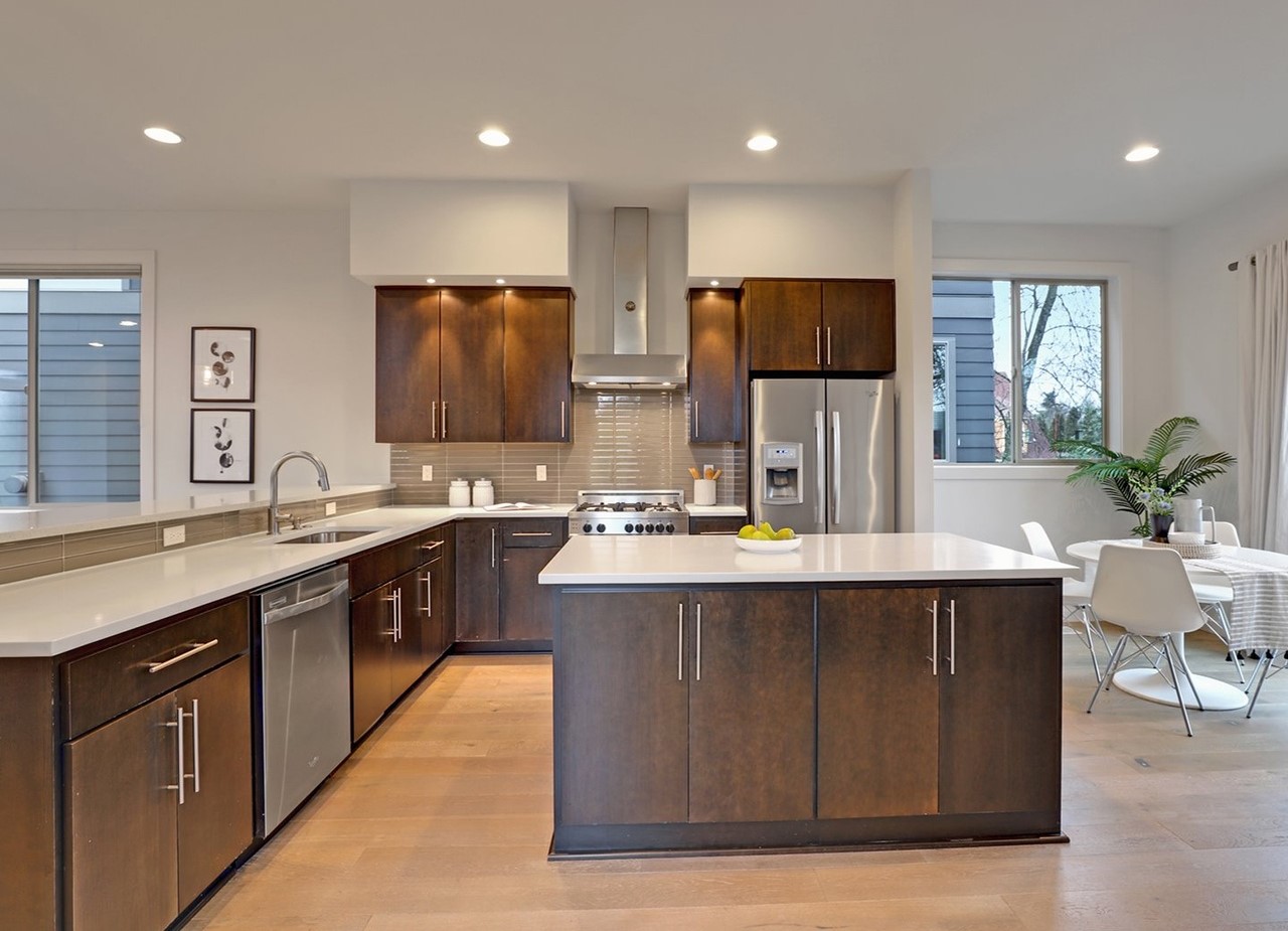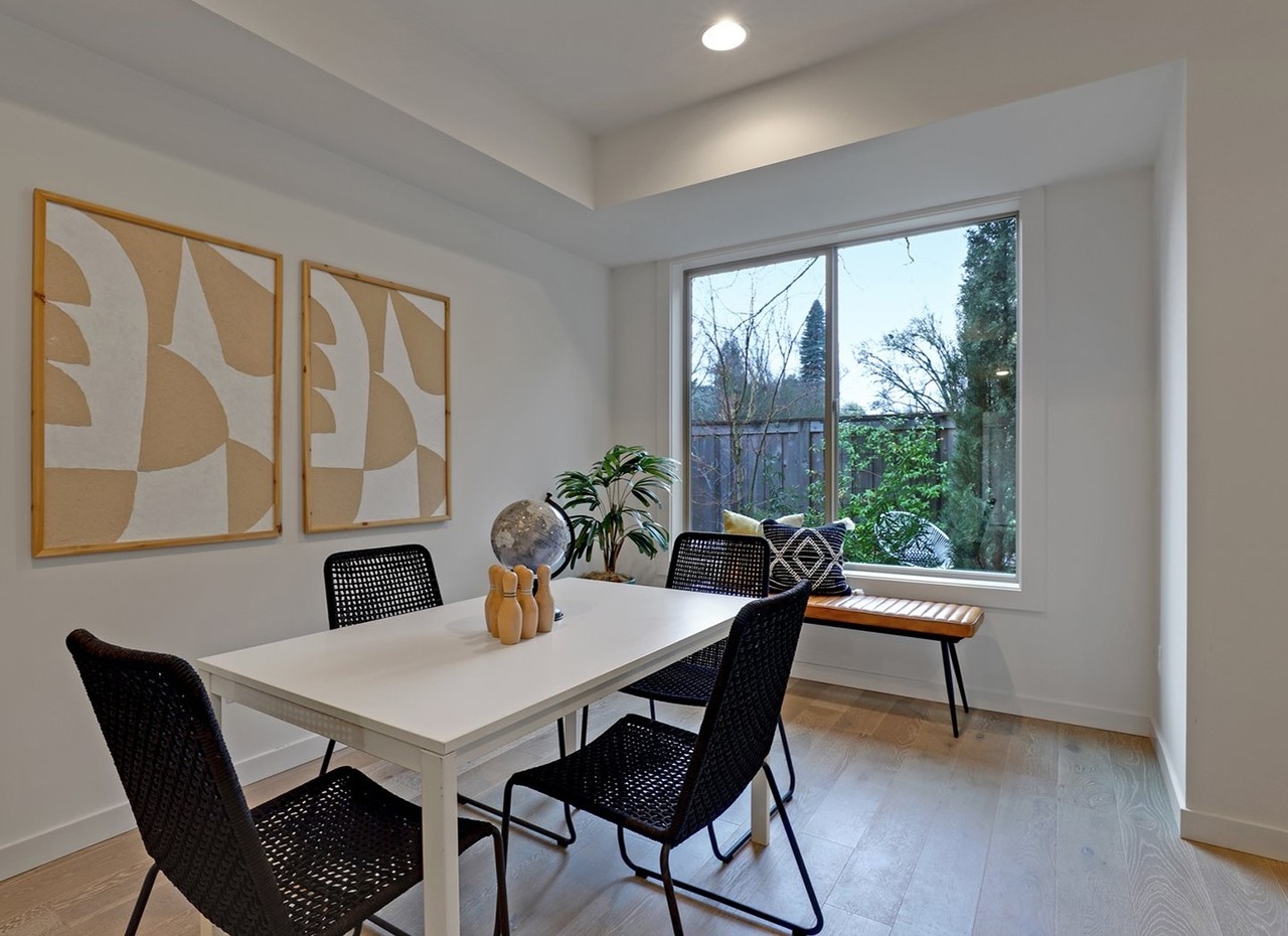 The kitchen sits at the heart of the main floor, offering an oversized island perfect for casual dining, entertaining, or food preparation. Full-height cabinetry, modern appliances, and ample countertop space make cooking a pleasure. Adjacent to the kitchen, a cozy nook area provides space for a casual dining table or built-in banquette, creating an intimate family gathering spot.