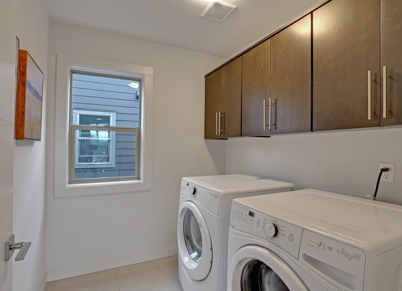 At the front of the home, two secondary bedrooms each feature large windows and closet space, perfect for children, guests, or additional home office needs. A full bath with dual vanities and a tub/shower combination serves these bedrooms, while a separate laundry room completes the upper floor with convenience.
