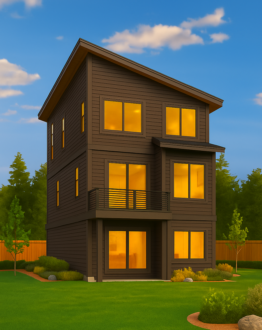 The exterior features clean lines, bold verticality, and a modern shed roof that emphasizes height and light. Carefully placed windows create privacy while filling the home with natural light from all sides. This plan is equally at home on infill city lots, tight suburban parcels, or view-driven hillside lots where vertical living is the ideal solution.